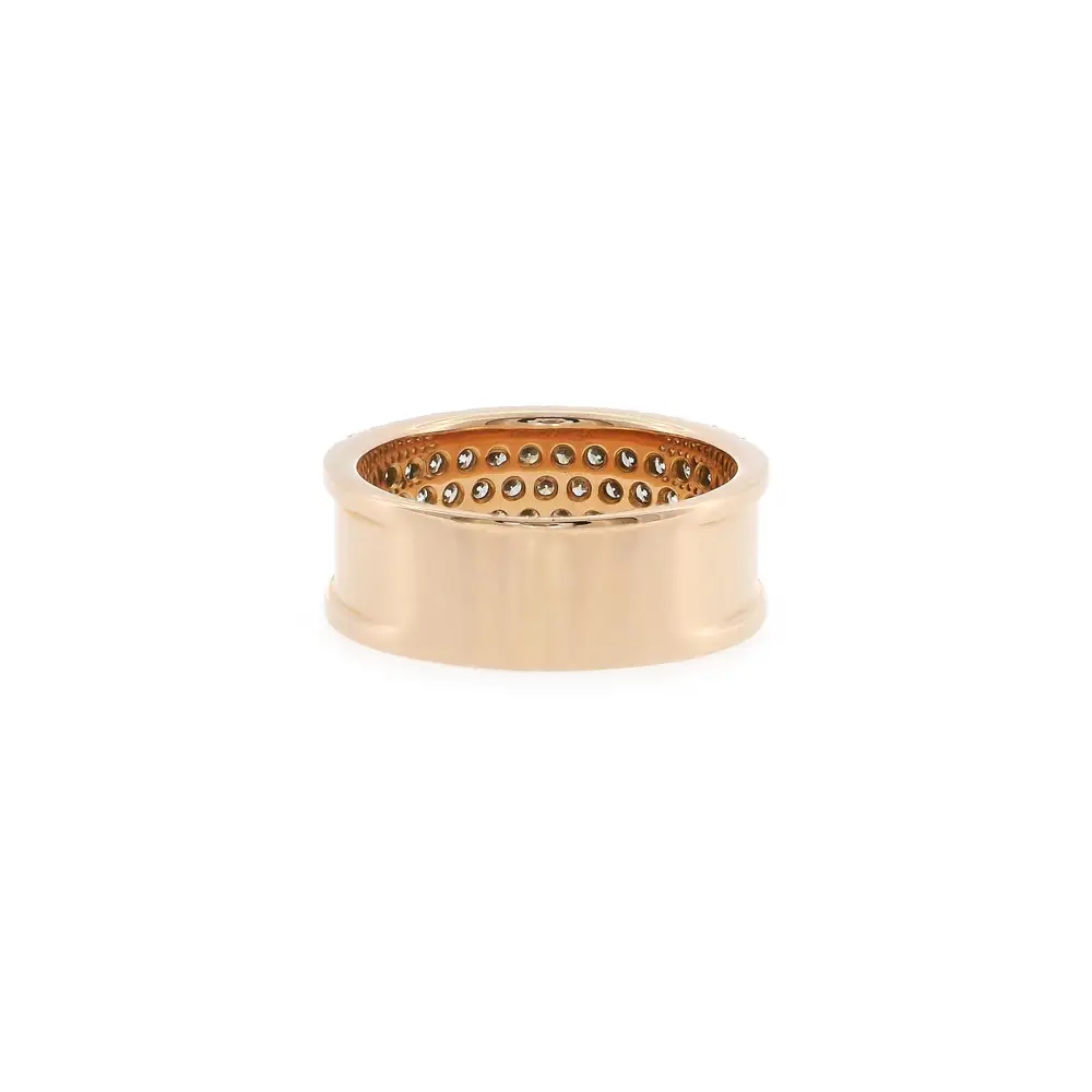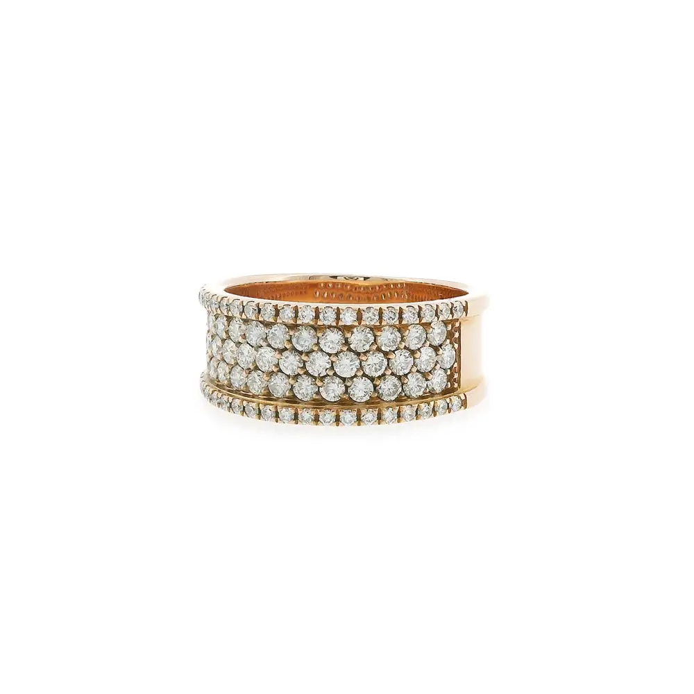 Tento luxusní prsten z růžového zlata zaujme výrazným designem širokého prstenu, který působí sebevědomě a elegantně zároveň. Povrch prstenu je bohatě osazen brilianty o celkové hmotnosti 0,90 ct, jejichž pravidelné uspořádání vytváří intenzivní třpyt a mimořádný vizuální efekt.