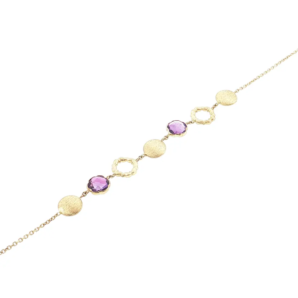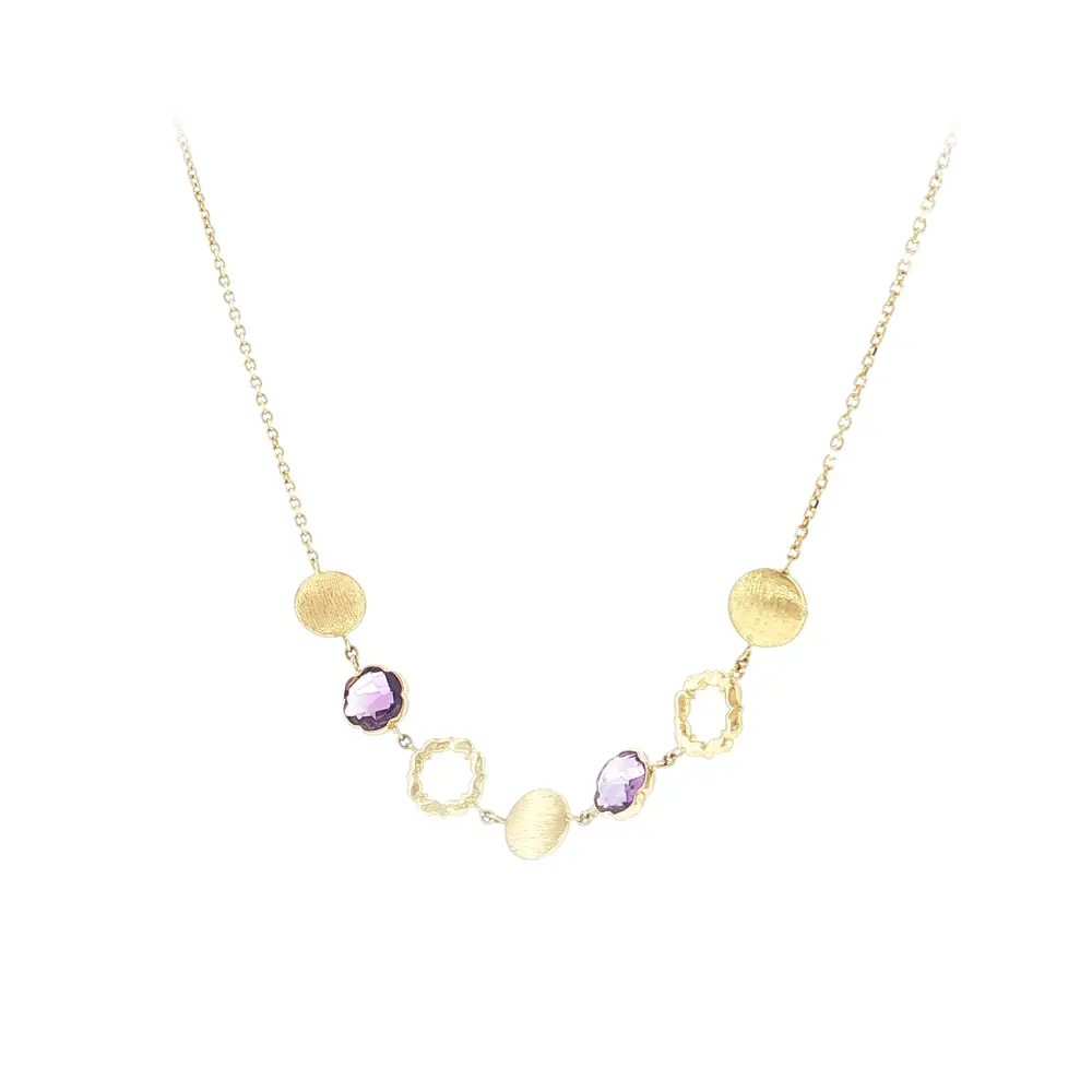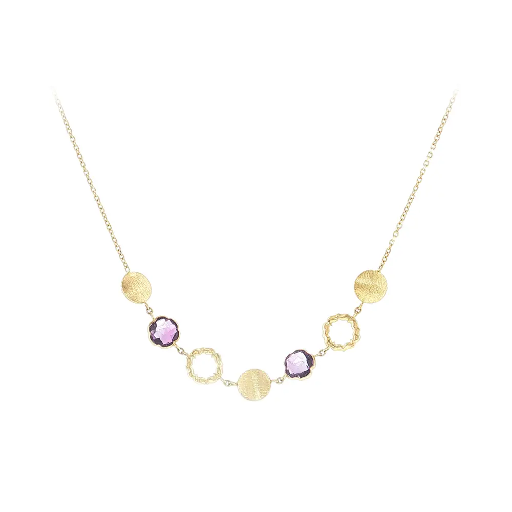 Luxusní náhrdelník ze 14kt zlata s fialovými kameny je elegantní šperk, který zaujme na první pohled svým jemným designem a sofistikovaným leskem. Kombinace pravého 14kt zlata a zářivých fialových kamenů dodává náhrdelníku nadčasový vzhled vhodný pro každodenní nošení i slavnostní příležitosti.