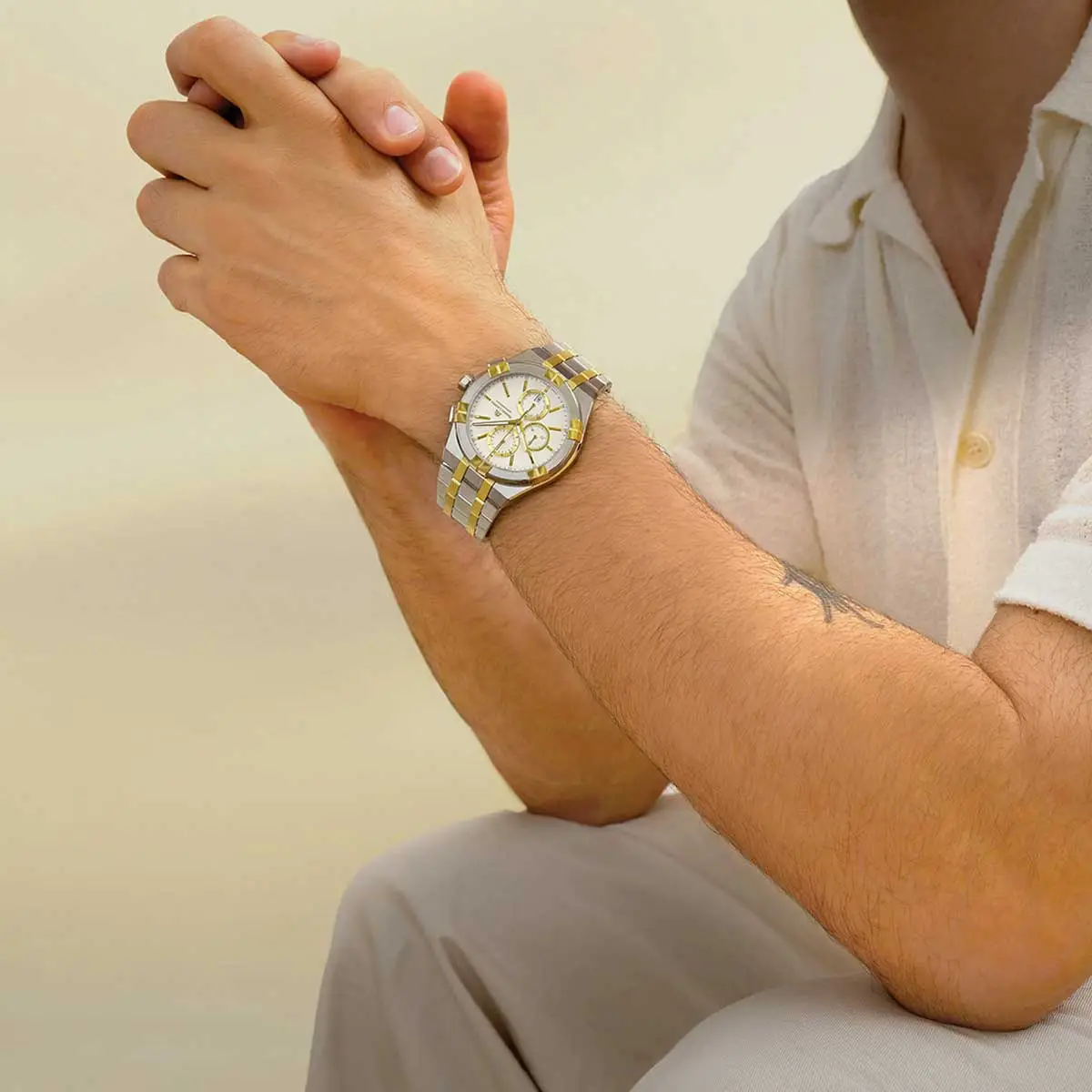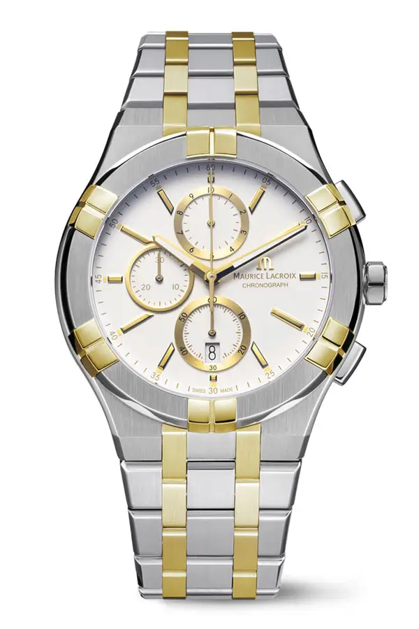 Model Aikon Chronograph AI1118-PVY03-130-1 od Maurice Lacroix spojuje moderní design s funkční precizností. Jeho kulaté pouzdro o průměru 42 mm z kvalitní nerezové oceli se zlatým PVD lemem působí luxusně a zároveň sportovně. Bicolor ocelový náramek, rovněž se žlutým zlacením, dodává hodinkám sofistikovaný vzhled vhodný pro každou příležitost.