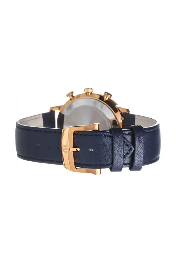 Kulaté pouzdro o průměru 40 mm je vyrobeno z ušlechtilé oceli s růžovým zlacením, které dodává hodinkám sofistikovaný vzhled. Modrý analogový ciferník, chráněný safírovým sklem, nabízí tři subciferníky pro měření času a elegantní datumovku na pozici 4.