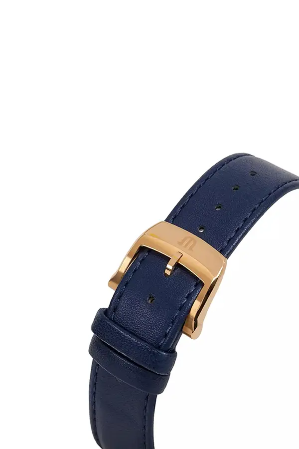 Celek dotváří modrý kožený pásek s klasickou trnovou sponou, který dokonale ladí s barvou ciferníku a podtrhuje celkovou eleganci tohoto modelu.