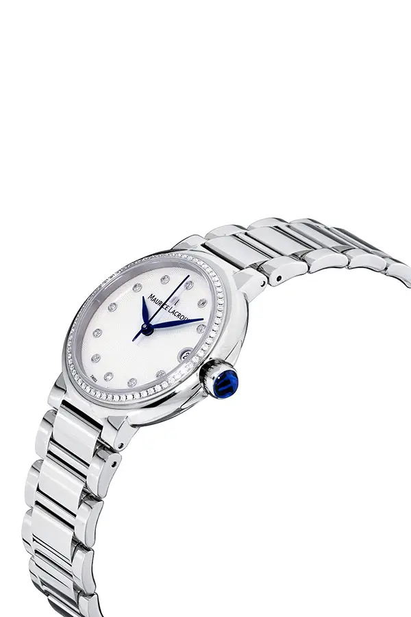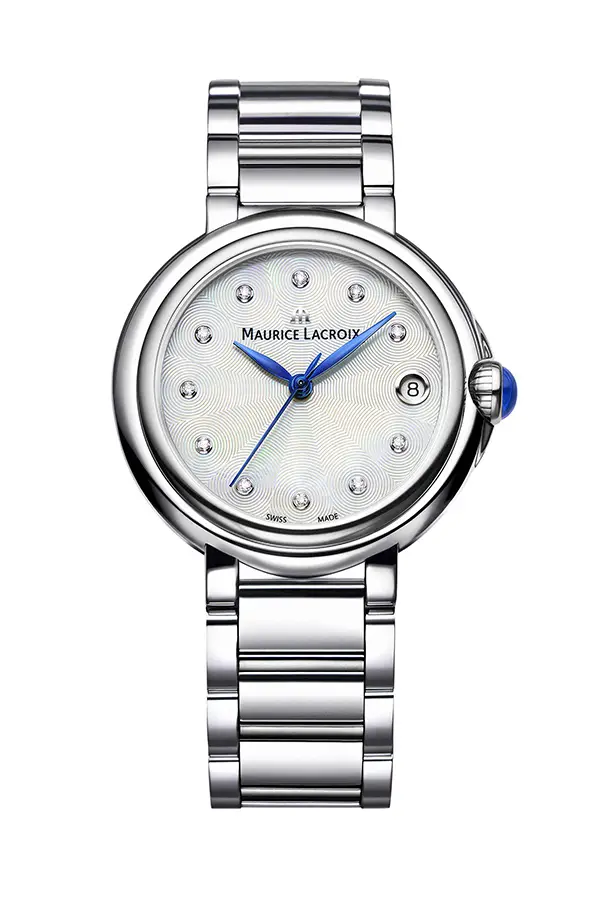 Minimalistický a zároveň rafinovaně ženský model dámských hodinek z kolekce Fiaba od značky Maurice Lacroix. Na perletí vyloženém číselníku je namísto číslic vsazeno 11 diamantů. Dvanáctku číslic doplňuje ukazatel data, umístěný na pozici třetí hodiny. Hodinky mají výrazné, jasně modré ručičky, jež dobře kontrastují s leštěným ocelovým páskem.