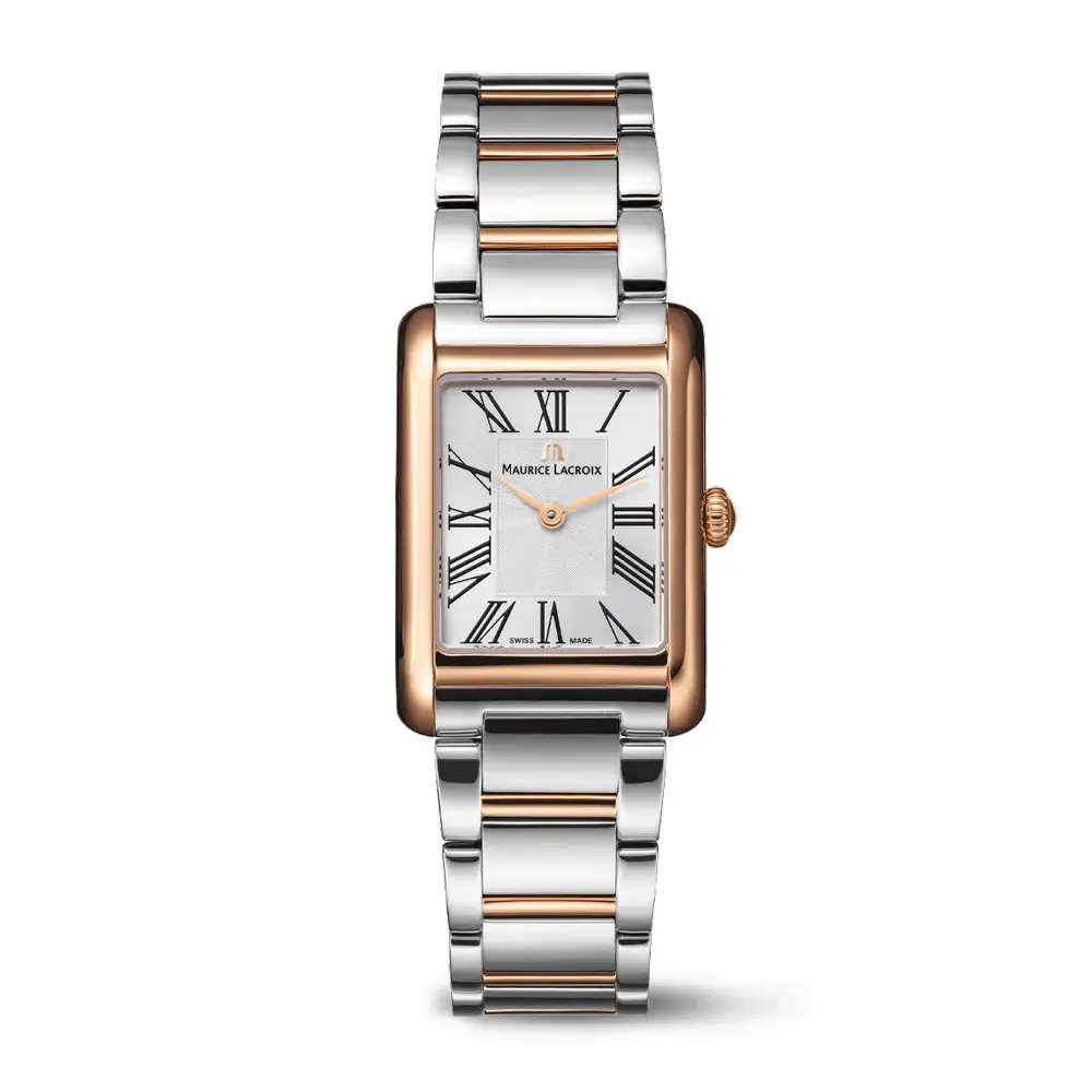Maurice Lacroix Fiaba Square FA1205-PVP02-110-A jsou elegantní dámské hodinky, které spojují jemné linie, švýcarskou přesnost a sofistikovaný dvoubarevný design. Obdélníkové pouzdro o velikosti 24 × 34 mm je vyrobeno z leštěné oceli a zušlechtěno růžově zlatou PVD úpravou, která dodává modelu luxusní vzhled. Díky výšce pouhých 6,5 mm působí hodinky mimořádně subtilně.