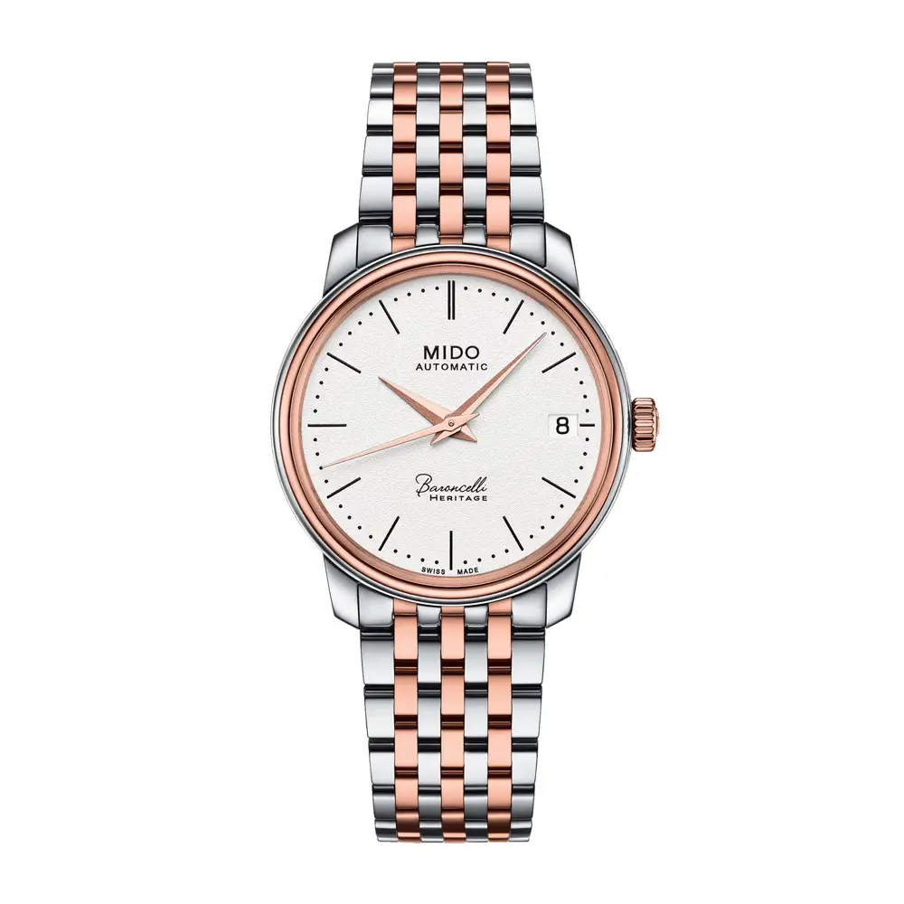 Hodinky Mido Baroncelli Heritage Lady jsou elegantním a nadčasovým dámským modelem, který v sobě spojuje švýcarskou preciznost a jemnou estetiku. Jejich kulaté pouzdro o průměru 33 mm je vyrobeno z kvalitní oceli, doplněné o detaily s růžovým zlacením, které se promítají i do lunety, čímž dodávají hodinkám sofistikovaný a moderní vzhled.