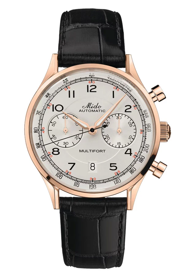 Hodinky Mido Multifort Patrimony Chronograph představují elegantní propojení klasického stylu, jemných detailů a švýcarské hodinářské kvality. Jejich kulaté pouzdro o průměru 42 mm je vyrobeno z oceli s růžovým zlacením, které hodinkám dodává sofistikovaný a luxusní vzhled. Odolné safírové sklo zajišťuje dokonalou ochranu ciferníku a výbornou čitelnost.