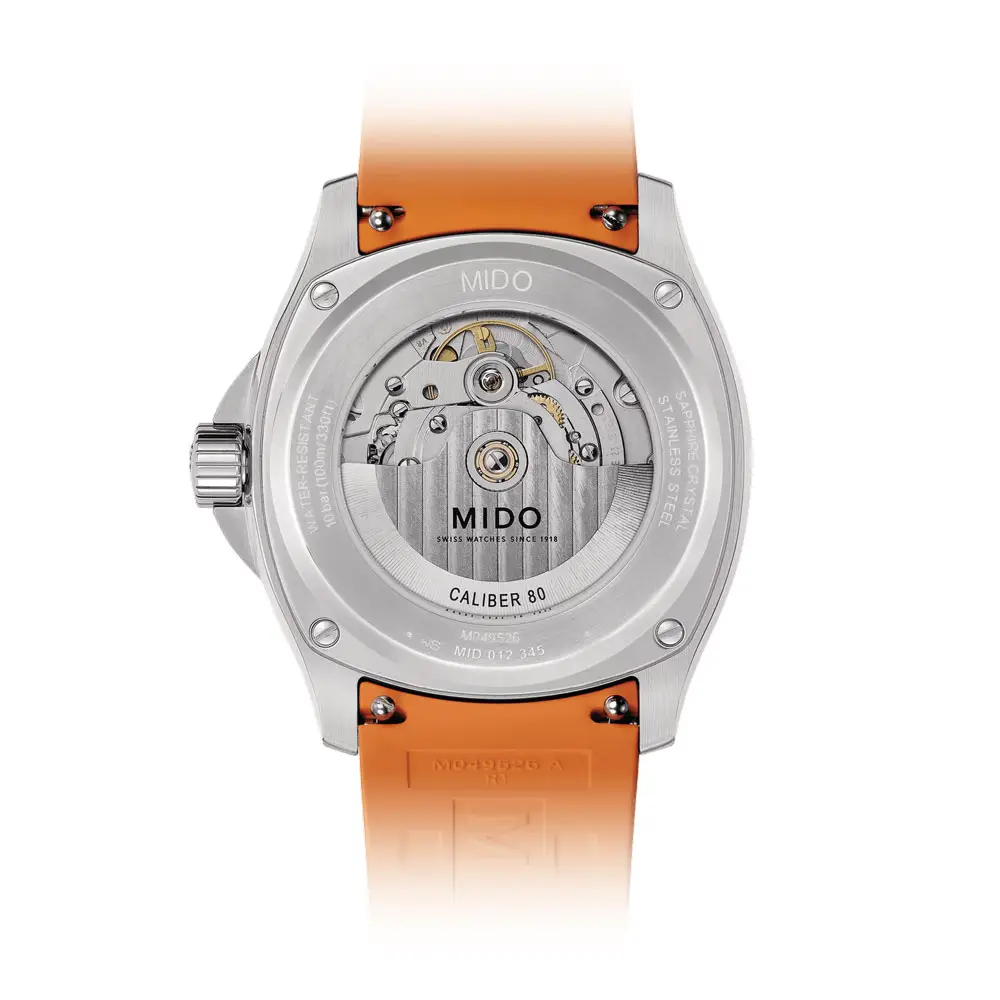 Uvnitř pracuje automatický kalibr Mido Calibre 80 s rezervou chodu až 80 hodin a moderní spirálou Nivachron™, zaručující odolnost vůči magnetismu a nárazům. Díky voděodolnosti 100 metrů (10 bar) a šroubovací korunce je model vhodný i pro aktivní životní styl.
