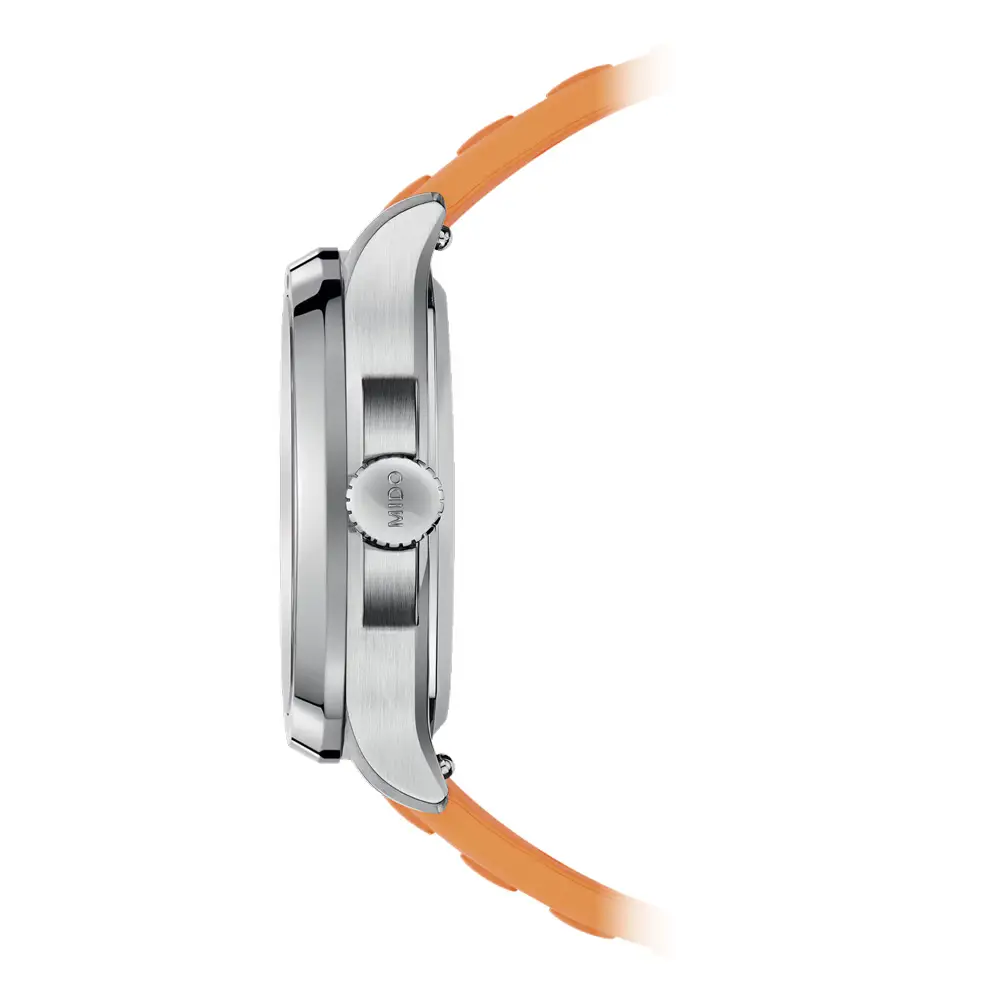Hodinky jsou osazeny oranžovým kaučukovým řemínkem s rychloupínacím systémem, který dodává sportovní energii a vysoký komfort nošení. Kombinace retro designu, špičkové technologie a švýcarské kvality činí z Multifort TV Big Date dokonalý doplněk pro každodenní eleganci.