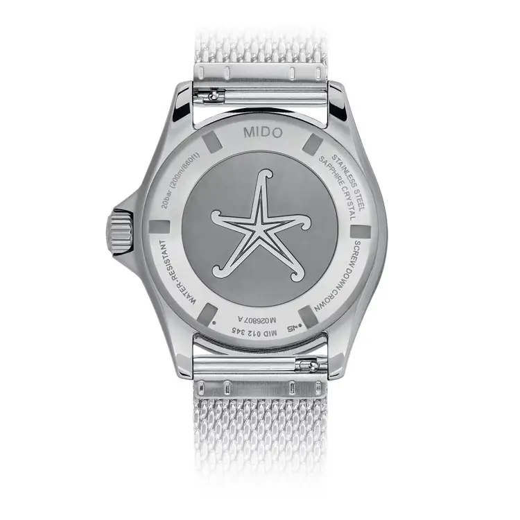 Srdcem modelu je automatický kalibr Mido Calibre 80, který poskytuje rezervu chodu až 80 hodin – výrazně více než běžné mechanické hodinky v této třídě. Strojek je vybaven antimagnetickým křemíkovým vláskem a nabízí přesnost i dlouhou životnost. Na dýnku najdeme charakteristický motiv hvězdice Ocean Star, symbolizující spojení s mořem a potápěčskou tradicí značky.