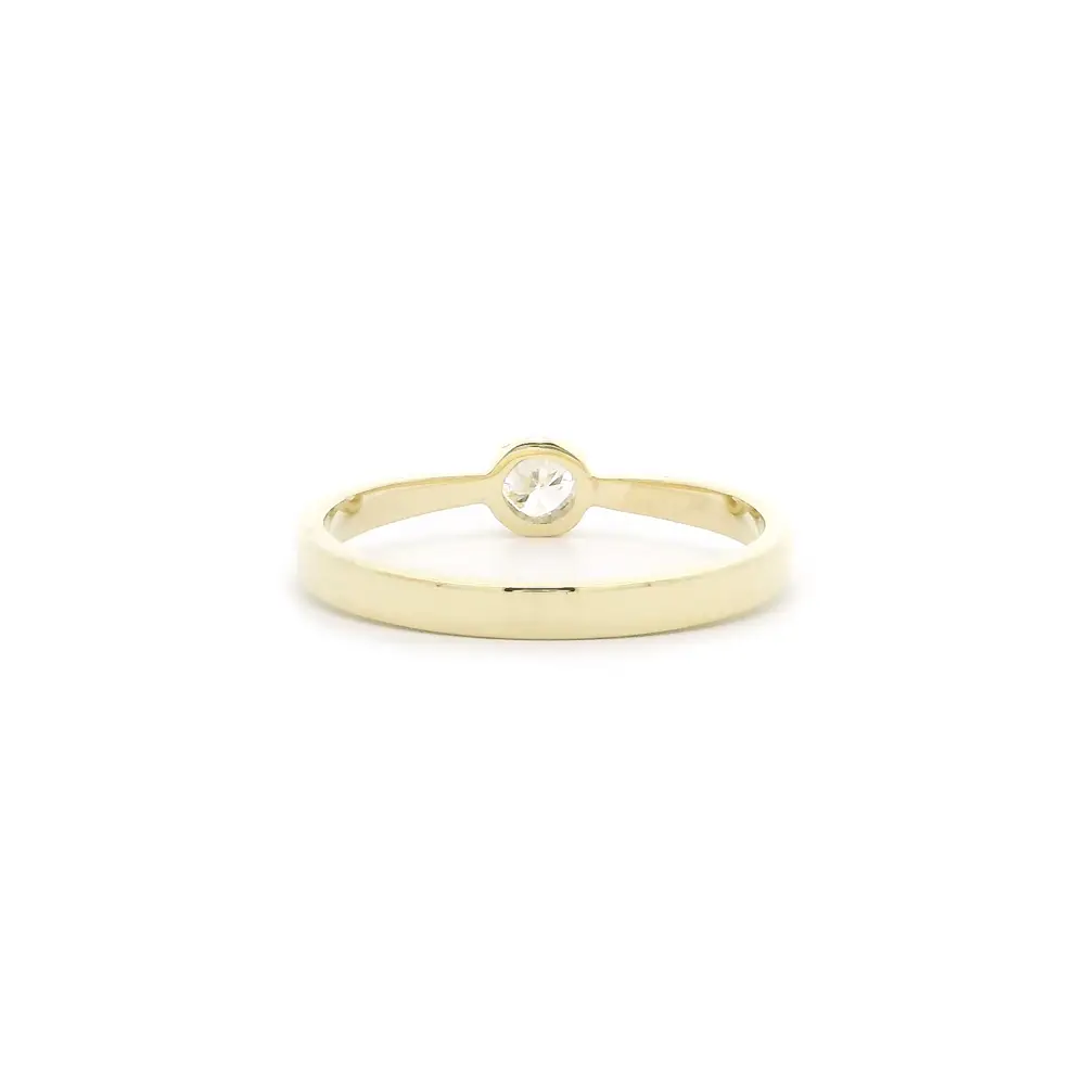 Minimalistický zásnubní prsten s diamantem v žlutém zlatě je symbolem elegance a čistoty. Jeho decentní linie nechávají vyniknout centrální kámen – diamant o váze 0,18 ct, v kvalitě barvy G a čistoty VS, který září s každým pohybem.