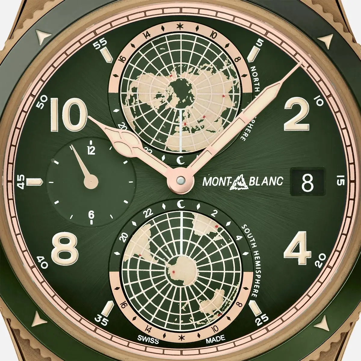 Na výrazném zeleném ciferníku se nachází dvě otočné zeměkoule zobrazující duální čas – severní a jižní polokouli – doplněné o datumovku a praktický indikátor dne a noci, což z těchto hodinek činí ideálního partnera pro cestování. Srdcem modelu je mechanický strojek MB 29.25 s automatickým nátahem, rezervou chodu přibližně 42 hodin, frekvencí 28 800 vph (4 Hz) a 26 kamennými uloženími, který zajišťuje plynulý a spolehlivý chod.
