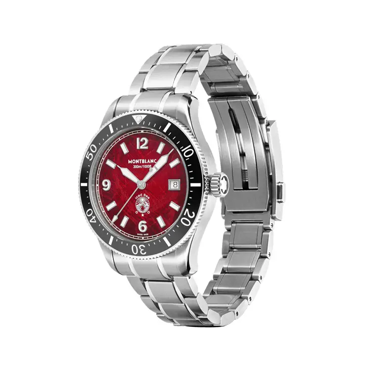Montblanc Iced Sea Automatic Date 132291 přináší sportovní eleganci s osobitým charakterem. Kulaté ocelové pouzdro o průměru 41 mm doplňuje výrazná keramická luneta a bordó analogový ciferník, jehož struktura evokuje hlubiny zamrzlého jezera – typický prvek této kolekce. Ciferník je doplněn praktickou datumovkou na třetí pozici a chráněn odolným safírovým sklem.