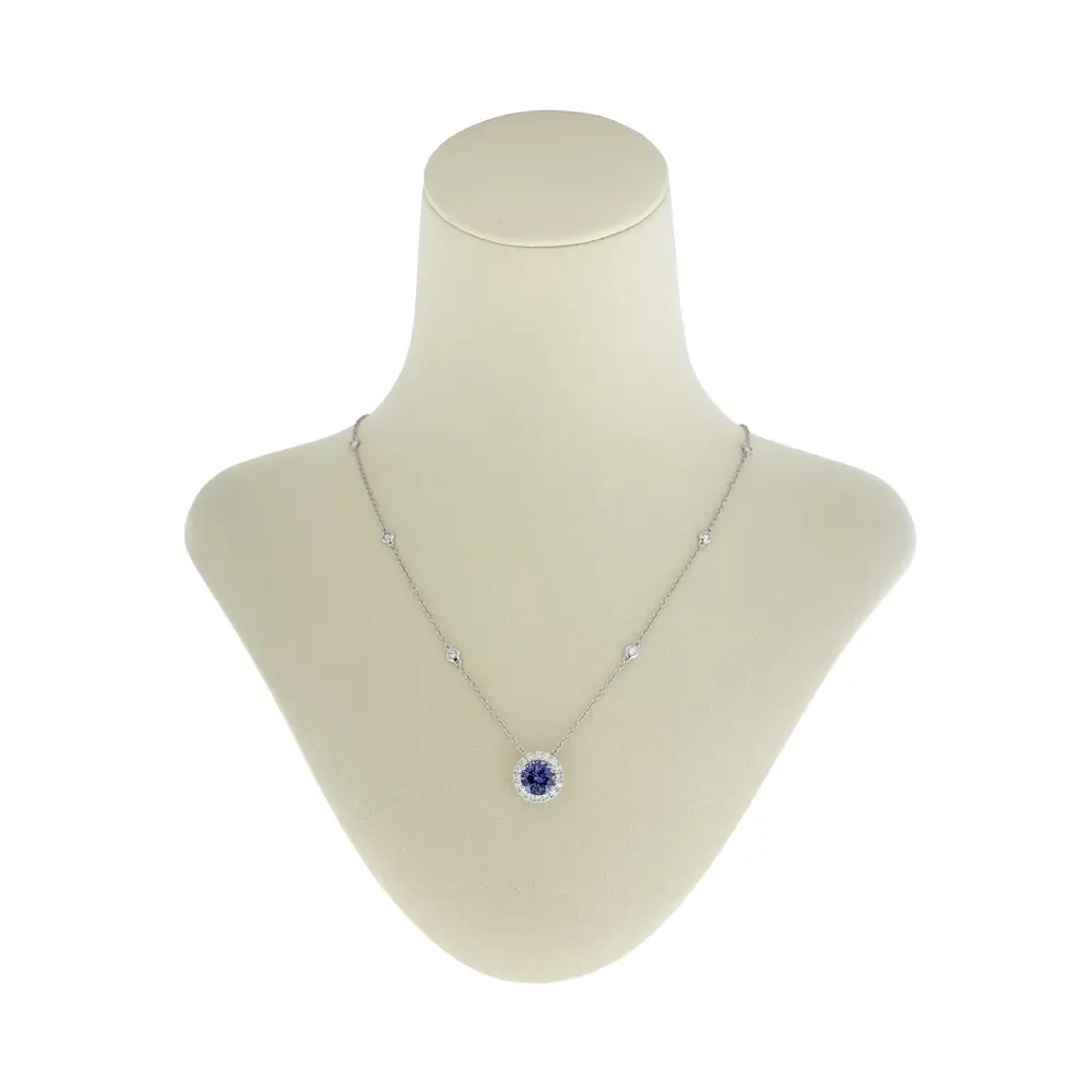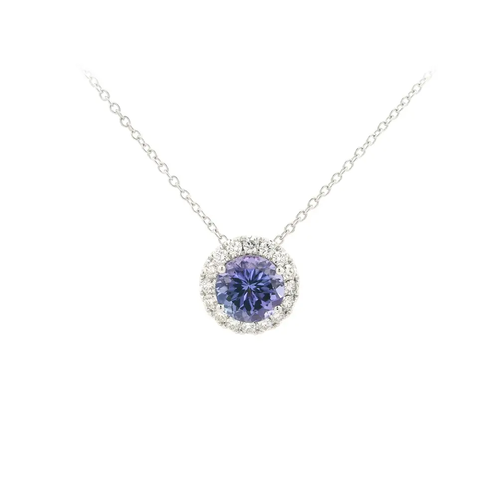 Tento jemný náhrdelník z 18kt bílého zlata okouzlí svým decentním, a přesto výrazným designem. V jeho středu září kulatý tanzanit s fascinující hrou odstínů mezi modrou a fialovou barvou, obklopený brilantním rámem z bílých diamantů, které zvýrazňují jeho přirozený třpyt.