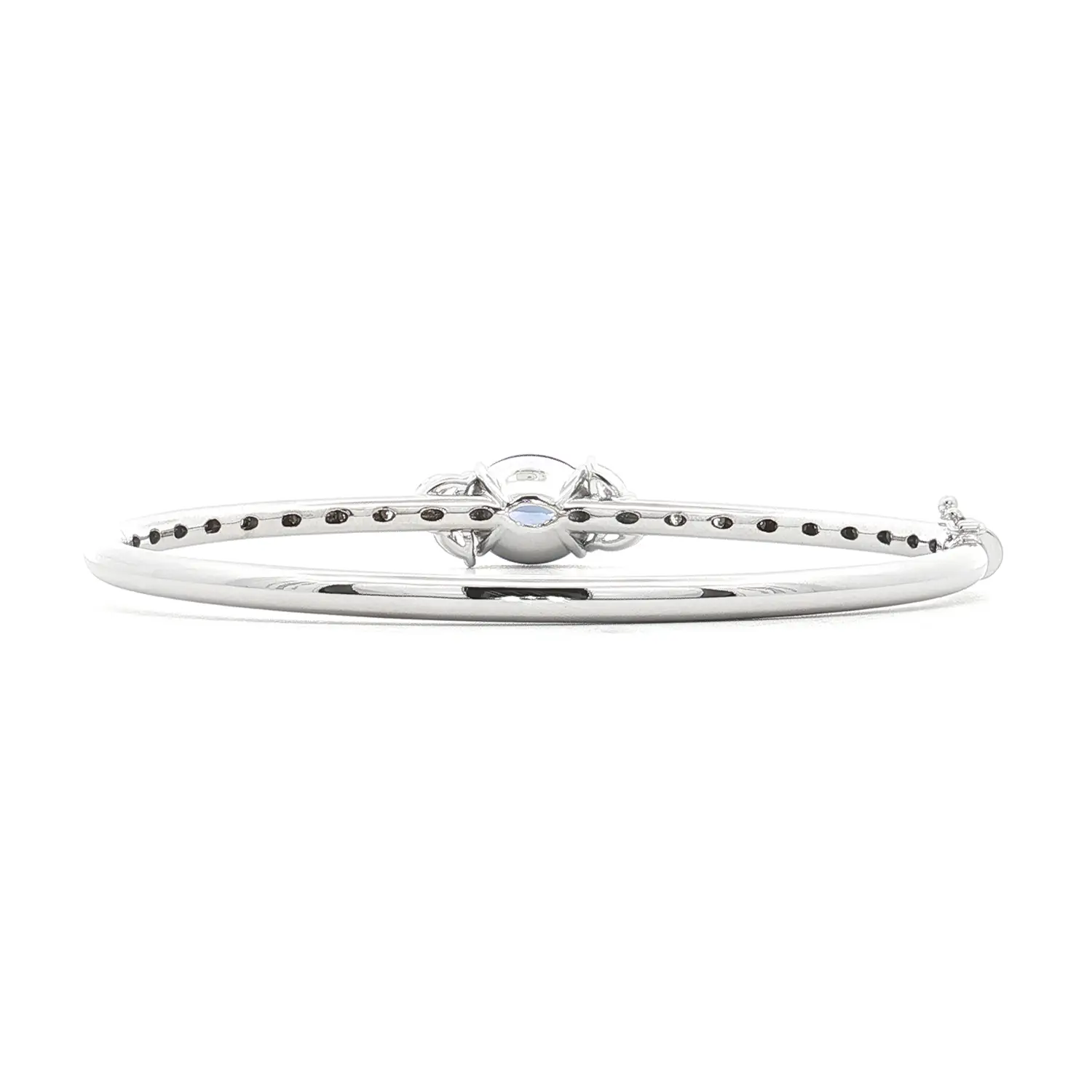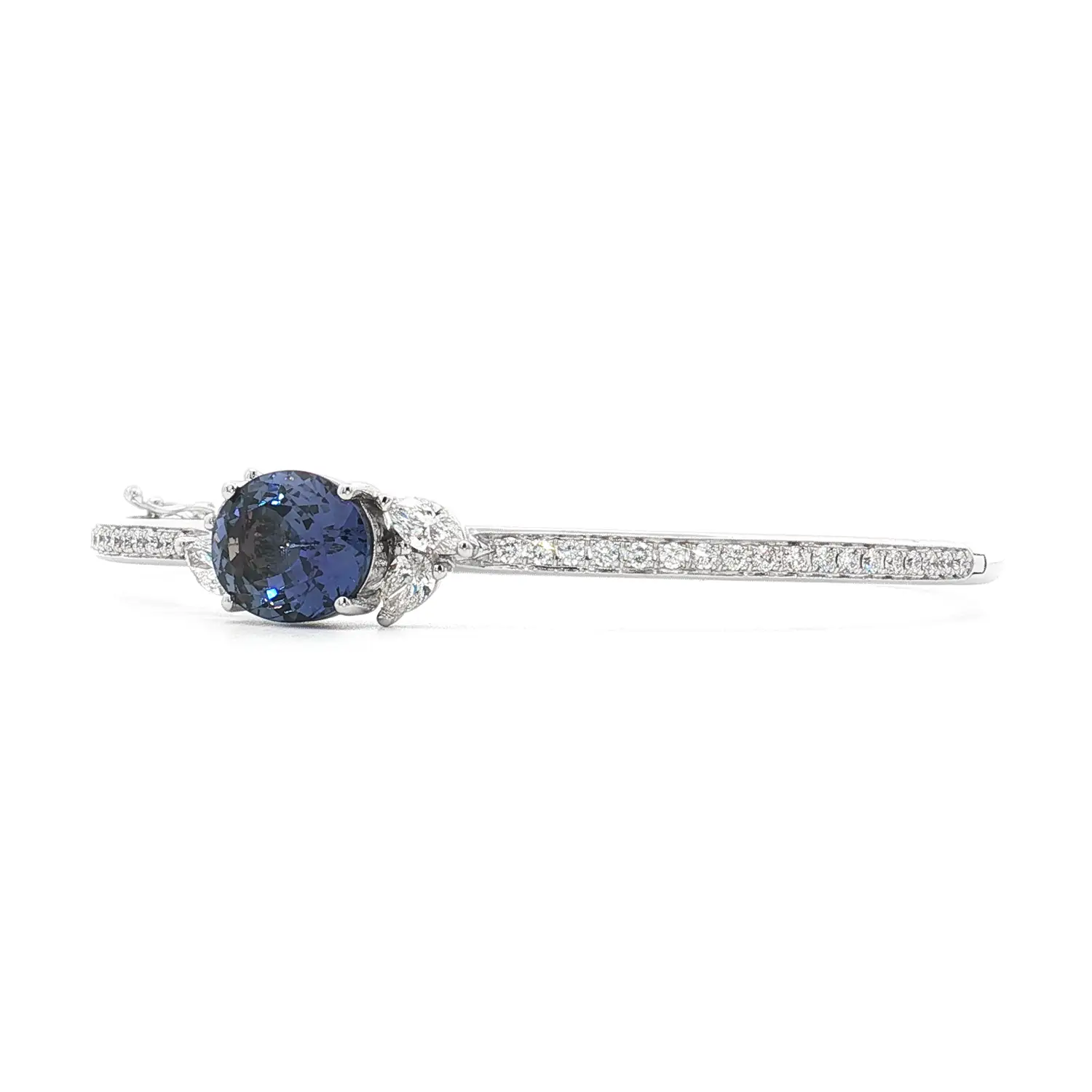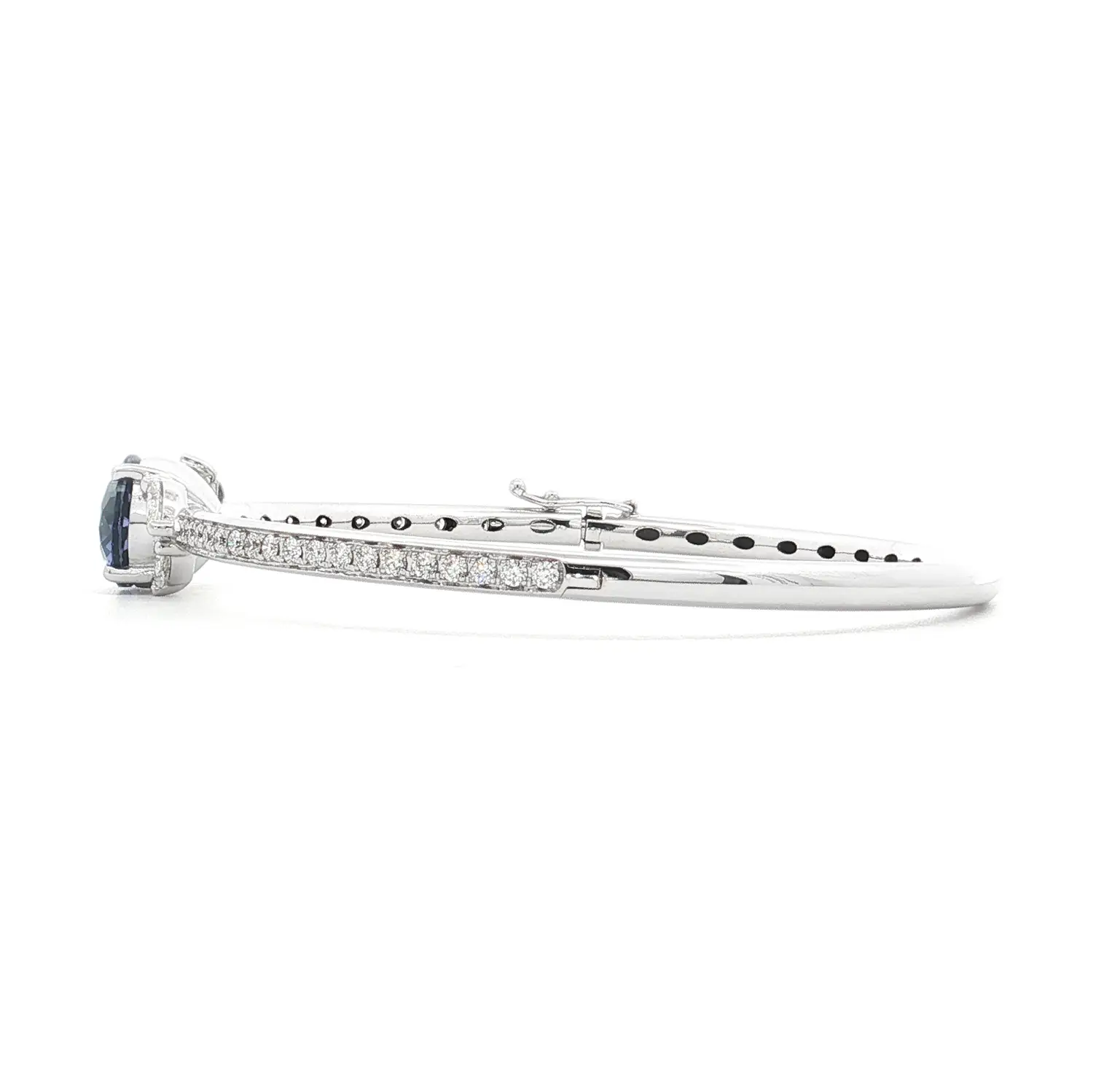 Vyrobený z 18kt bílého zlata, náramek je doplněn jemnou řadou diamantů zasazených po celé délce obroučky, což umocňuje jeho jiskřivý efekt. Tento šperk dokonale kombinuje moderní minimalismus s nadčasovým luxusem, a je ideální pro ženy, které oceňují precizní detaily, barevnou hloubku tanzanitu a neodolatelný třpyt diamantů.
