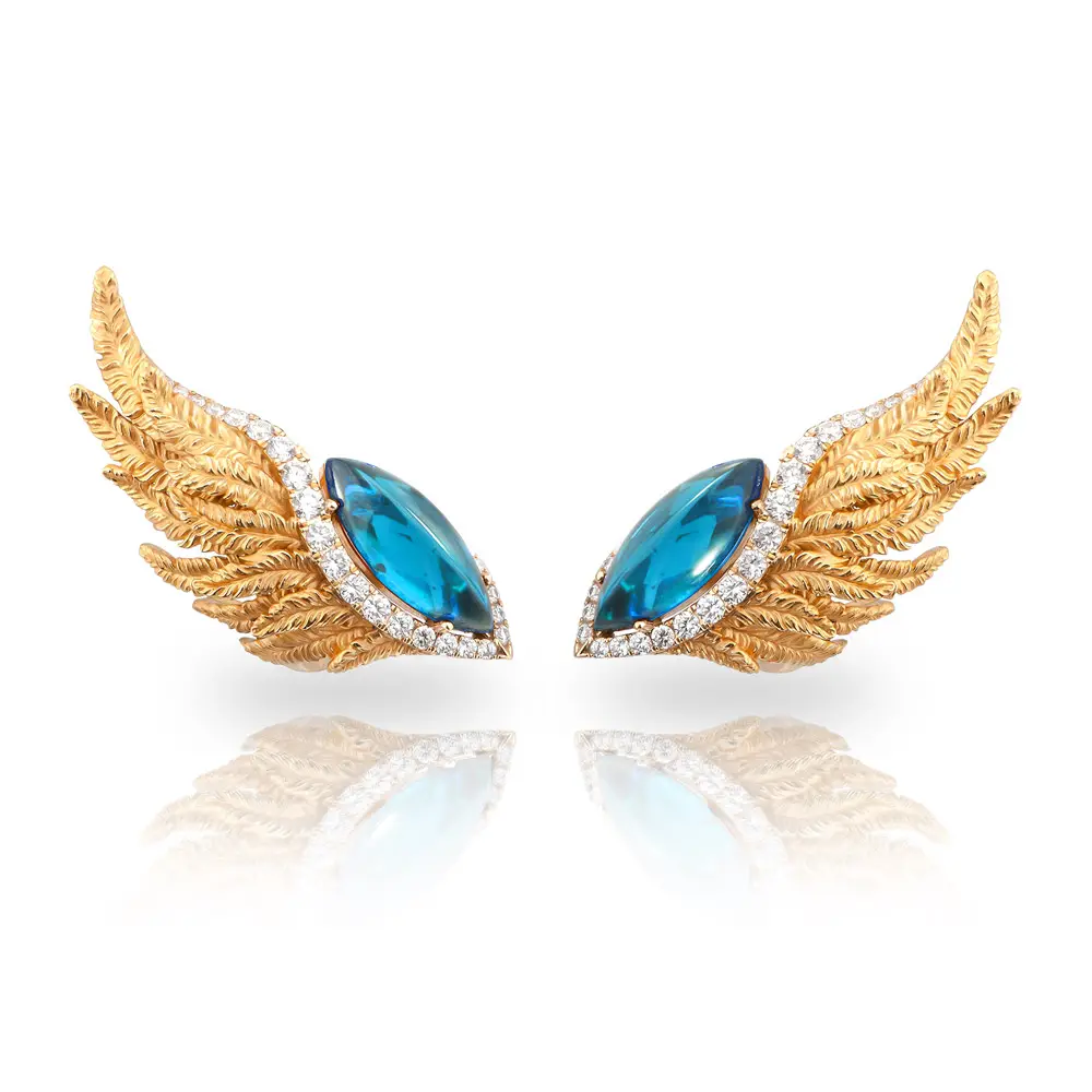 Dominantou jsou modré topazy o celkové hmotnosti 8,61 ct, které okouzlí svou hloubkou a jasem. Náušnice jsou doplněny 46 diamanty o celkové hmotnosti 0,69 ct, jež vytvářejí jemný třpyt a podtrhují luxusní charakter šperku.