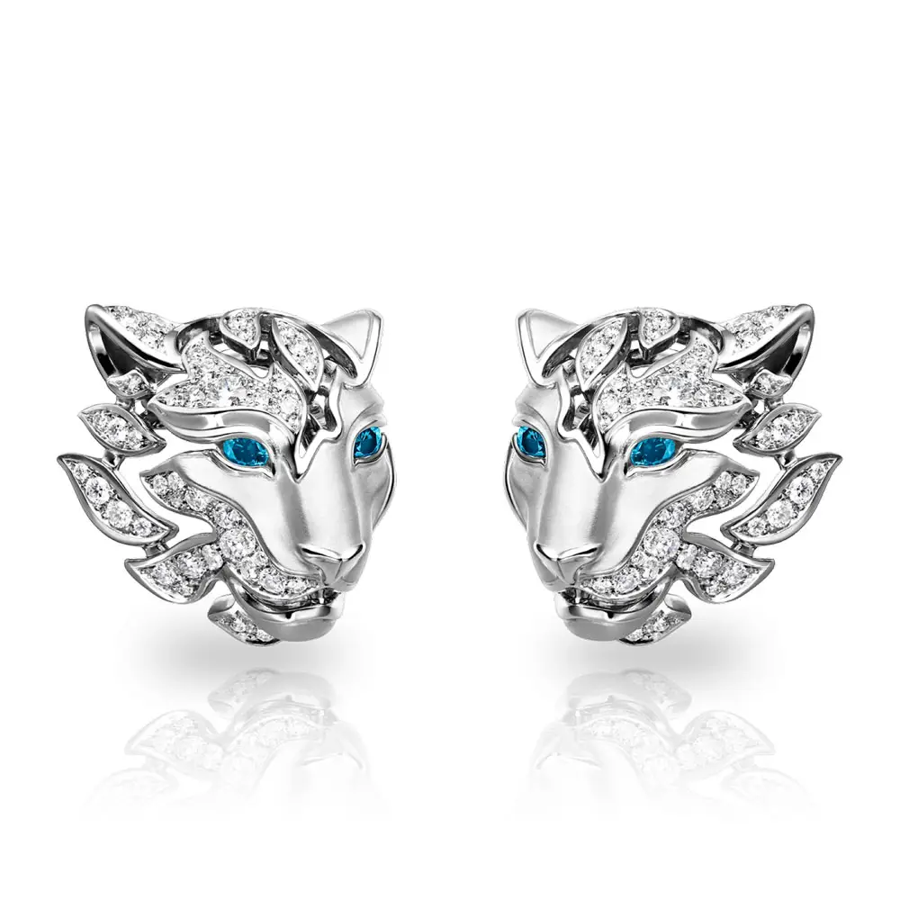 Zdobí je 88 brilantních diamantů o celkové hmotnosti 0,81 ct, které dodávají motivu zářivost a noblesu. Výrazné modré diamanty o váze 0,23 ct slouží jako oči obou šelem a propůjčují jim intenzivní pohled plný síly a charakteru. Náušnice působí sebevědomě, přitom si uchovávají jemnost a nositelnost pro denní i slavnostní příležitosti.