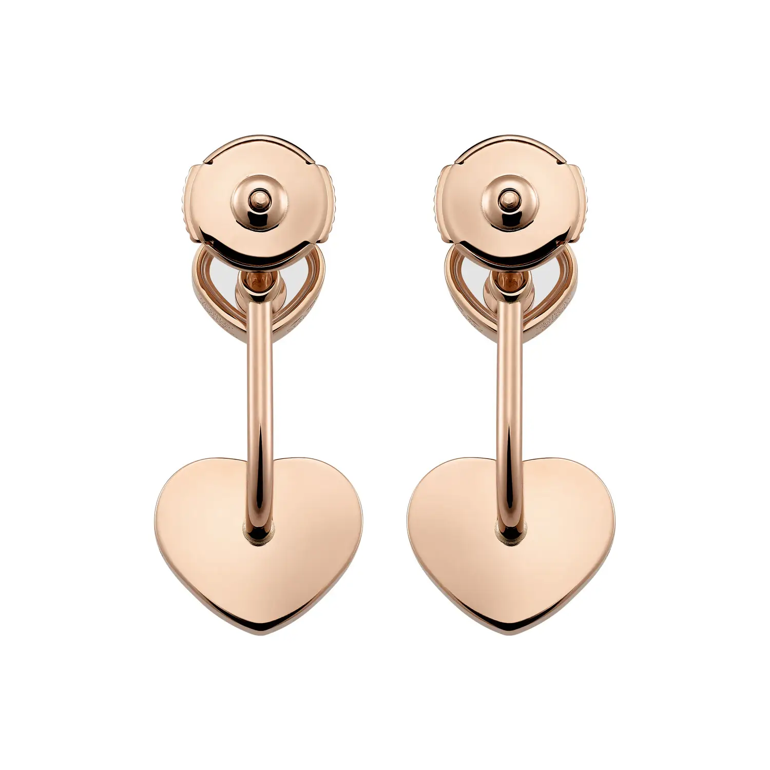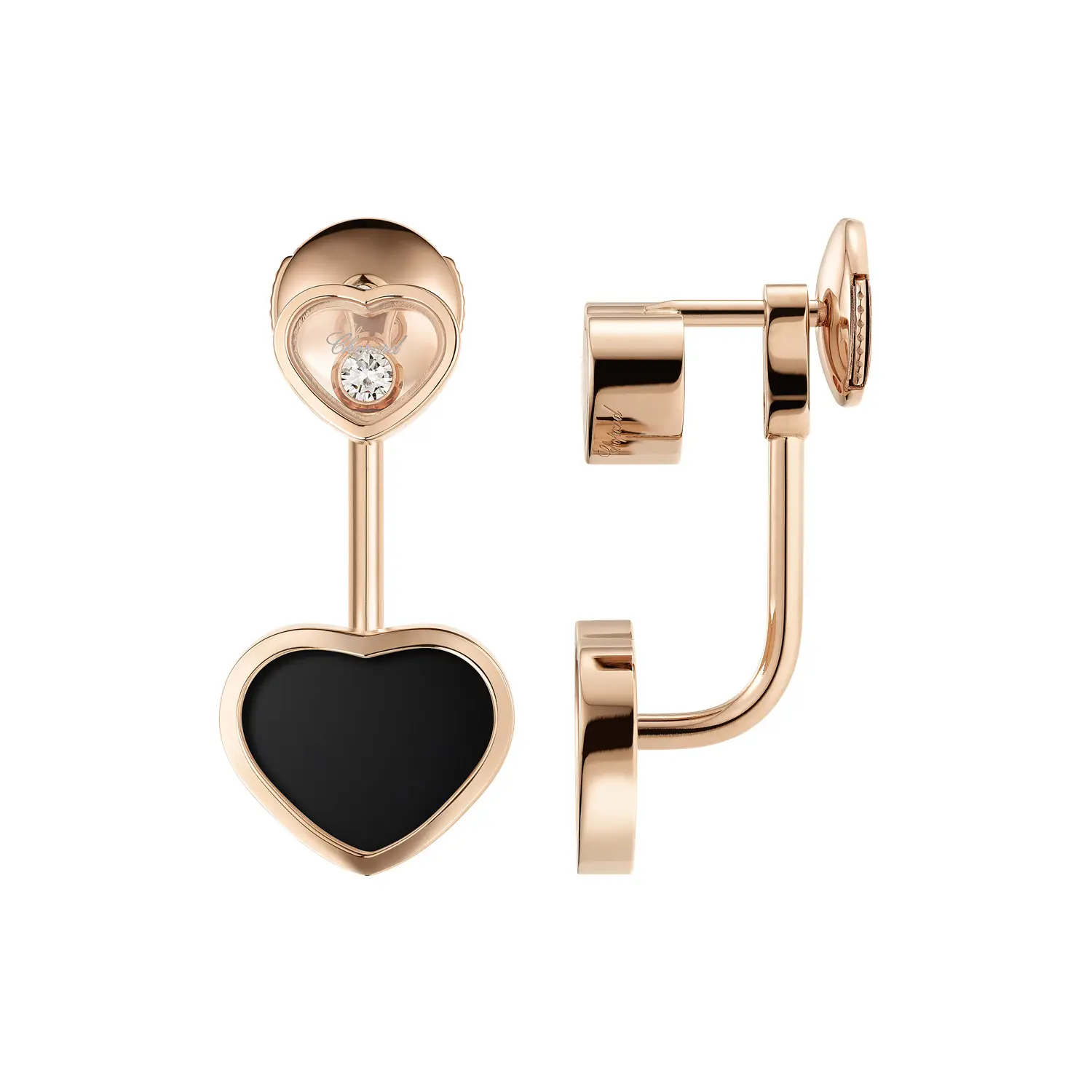 Náušnice Chopard Happy Hearts 83A082-5201 ztělesňují dokonalou rovnováhu mezi elegancí, kontrastem a ikonickým stylem značky. Vyrobeny z 18k etického růžového zlata, zdobeny srdíčky z černého onyxu a brilianty o celkové hmotnosti přibližně 0,10 ct, které se volně pohybují mezi dvěma safírovými sklíčky – charakteristický prvek kolekce Happy Hearts.