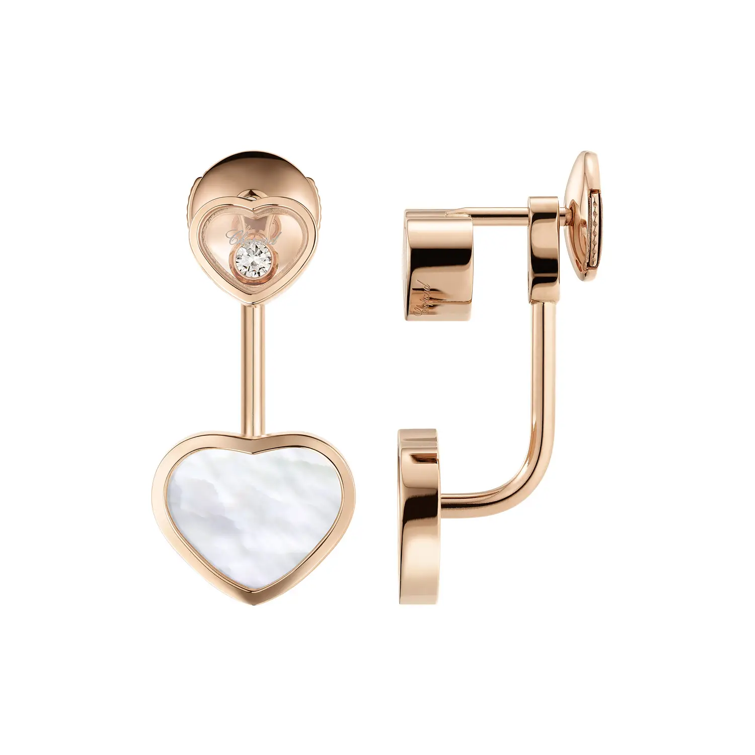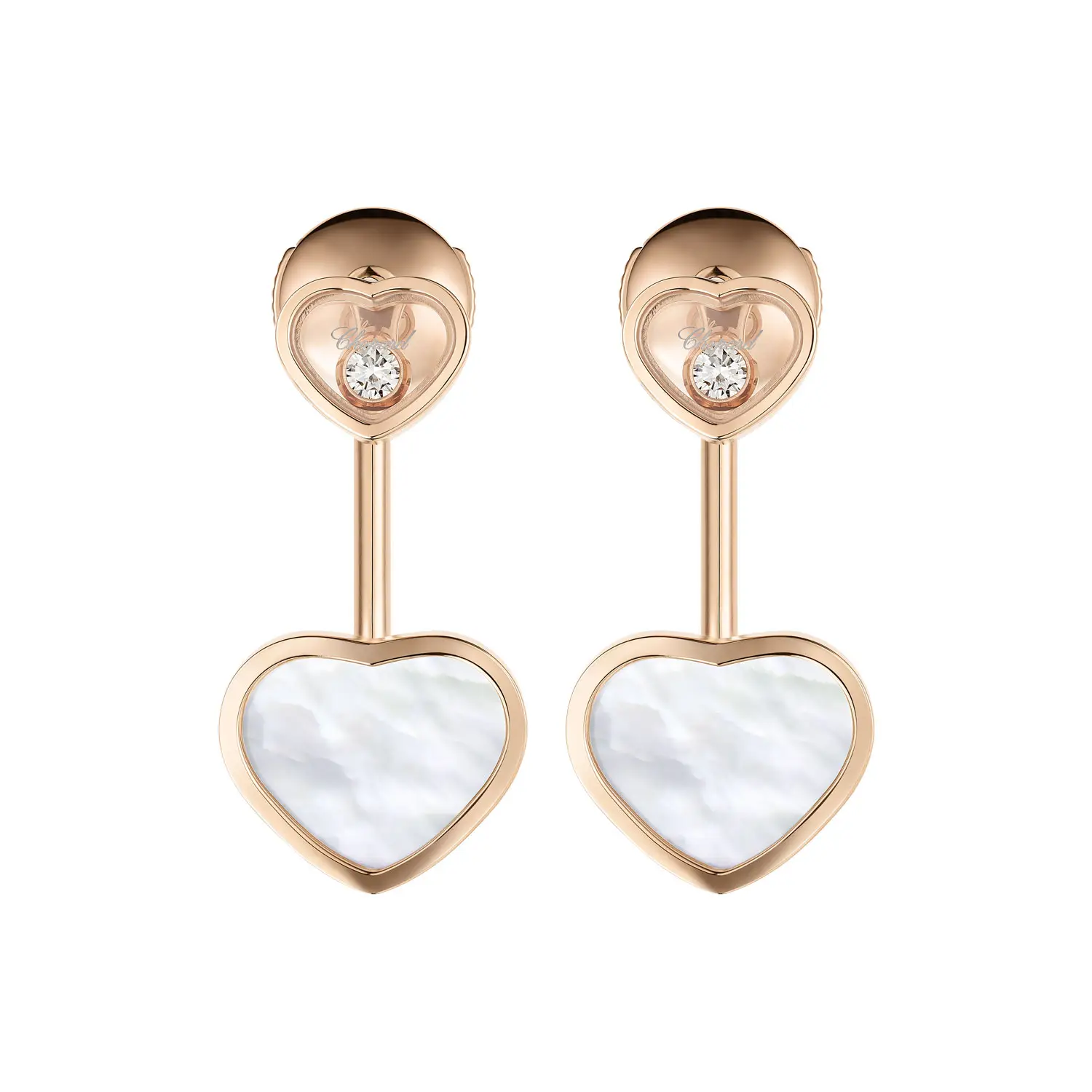 Náušnice Chopard Happy Hearts 83A082-5301 představují dokonalou kombinaci romantiky a elegance. Vyrobeny z 18k etického růžového zlata, zdobeny bílými srdíčky z perleti a brilianty o celkové hmotnosti přibližně 0,10 ct, které se volně pohybují mezi dvěma safírovými sklíčky – charakteristický motiv kolekce Happy Hearts symbolizující radost a svobodu.