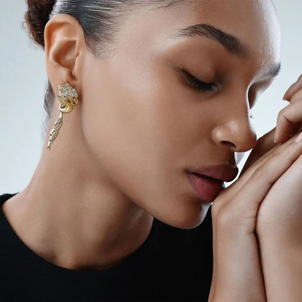 Carrera y Carrera New Shanghai Maxi Pavé představují fascinující pár náušnic, které ztělesňují mystickou krásu východní kultury. Ikonický motiv draka – symbol síly, ochrany a vznešenosti – je mistrovsky vytesán ze žlutého 18kt zlata a osazen 164 brilantními diamanty, jež září v jemně tvarovaných liniích.
