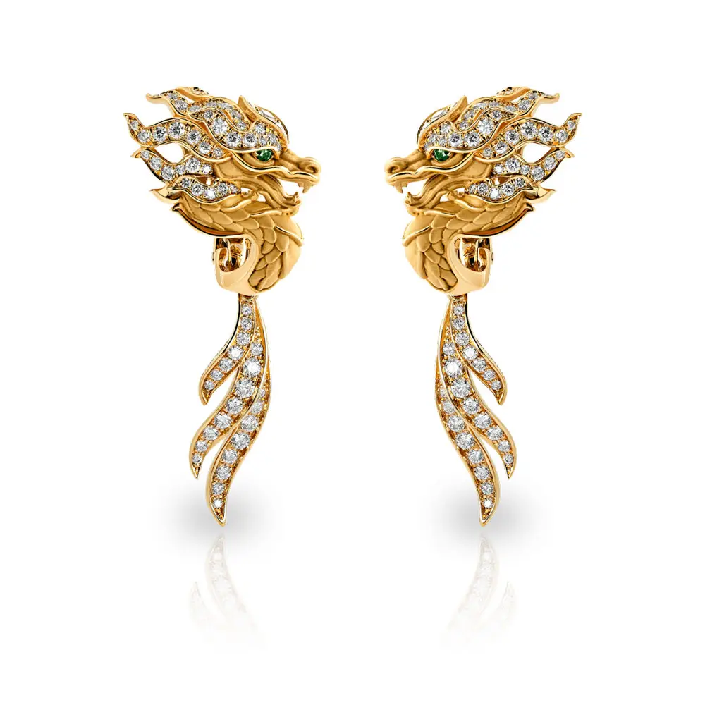 Výrazným detailem jsou čtyři zelené diamanty o celkové váze 0,07 ct, které slouží jako oči draků a propůjčují šperku jedinečný pohled – živý, silný a nepřehlédnutelný. Ladné zakřivení „dračí hřívy“ tvoří elegantní prodloužení směrem dolů, díky čemuž náušnice působí dynamicky a smyslně.