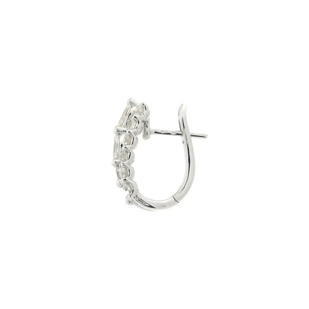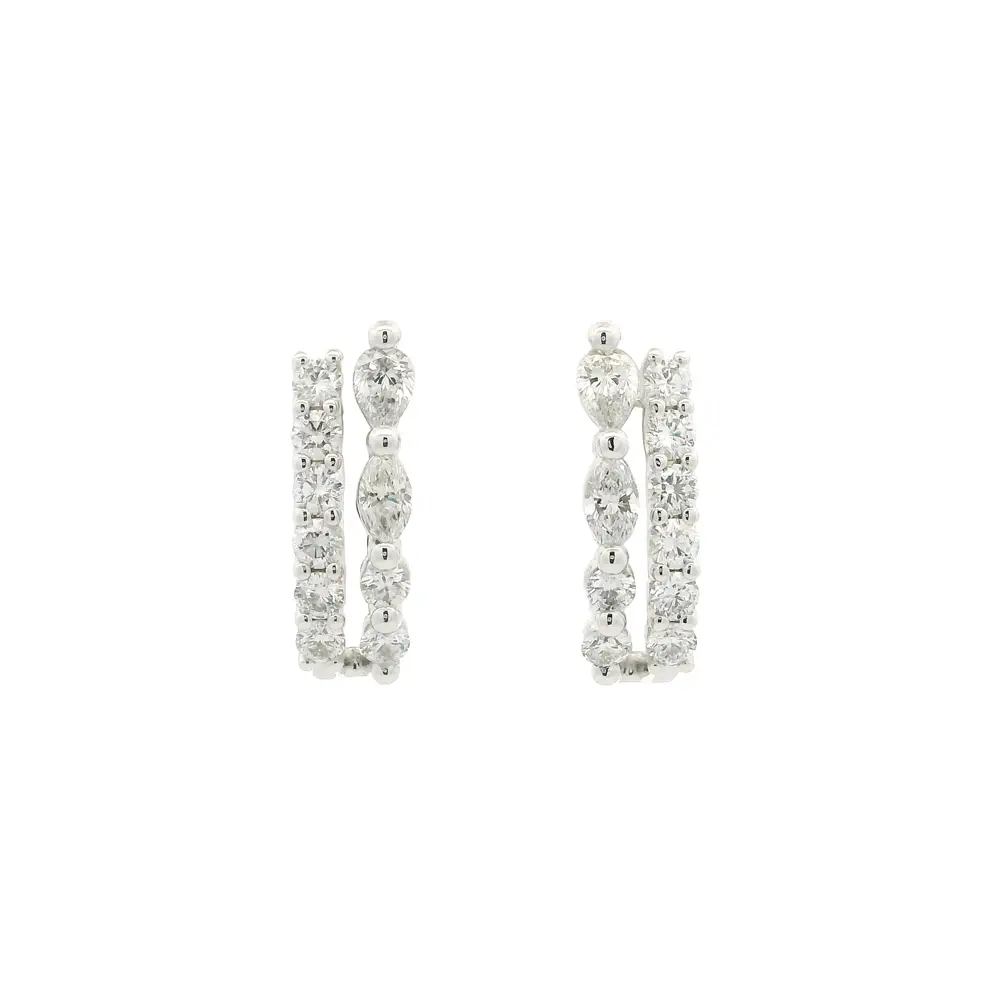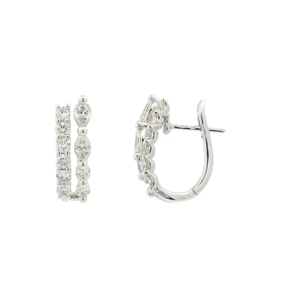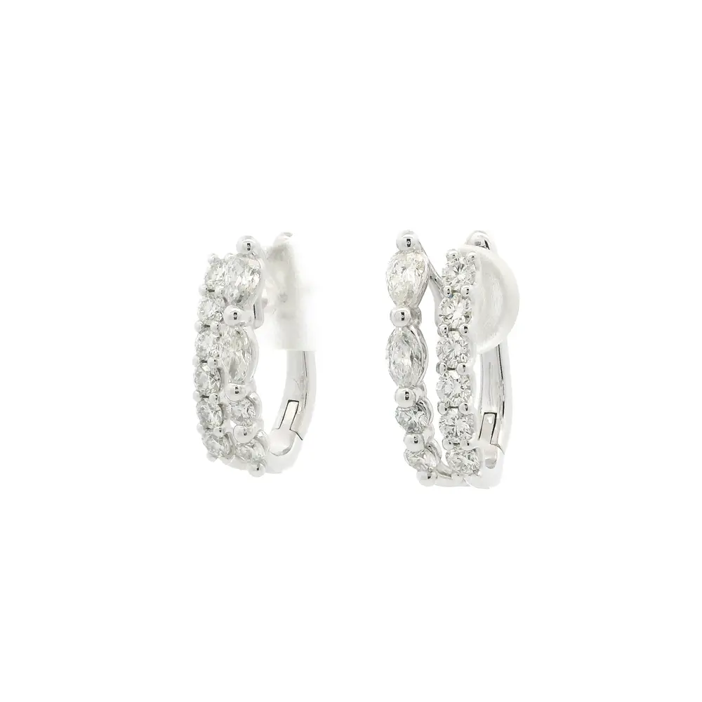 Tyto nádherné náušnice z 18kt bílého zlata zaujmou jedinečným spojením klasické elegance a moderního designu. Dvojitá linie kamenů vytváří efektní hloubku, kde se střídají kulaté brilianty a diamanty brusu marquise, jež společně odrážejí světlo s oslňující intenzitou.