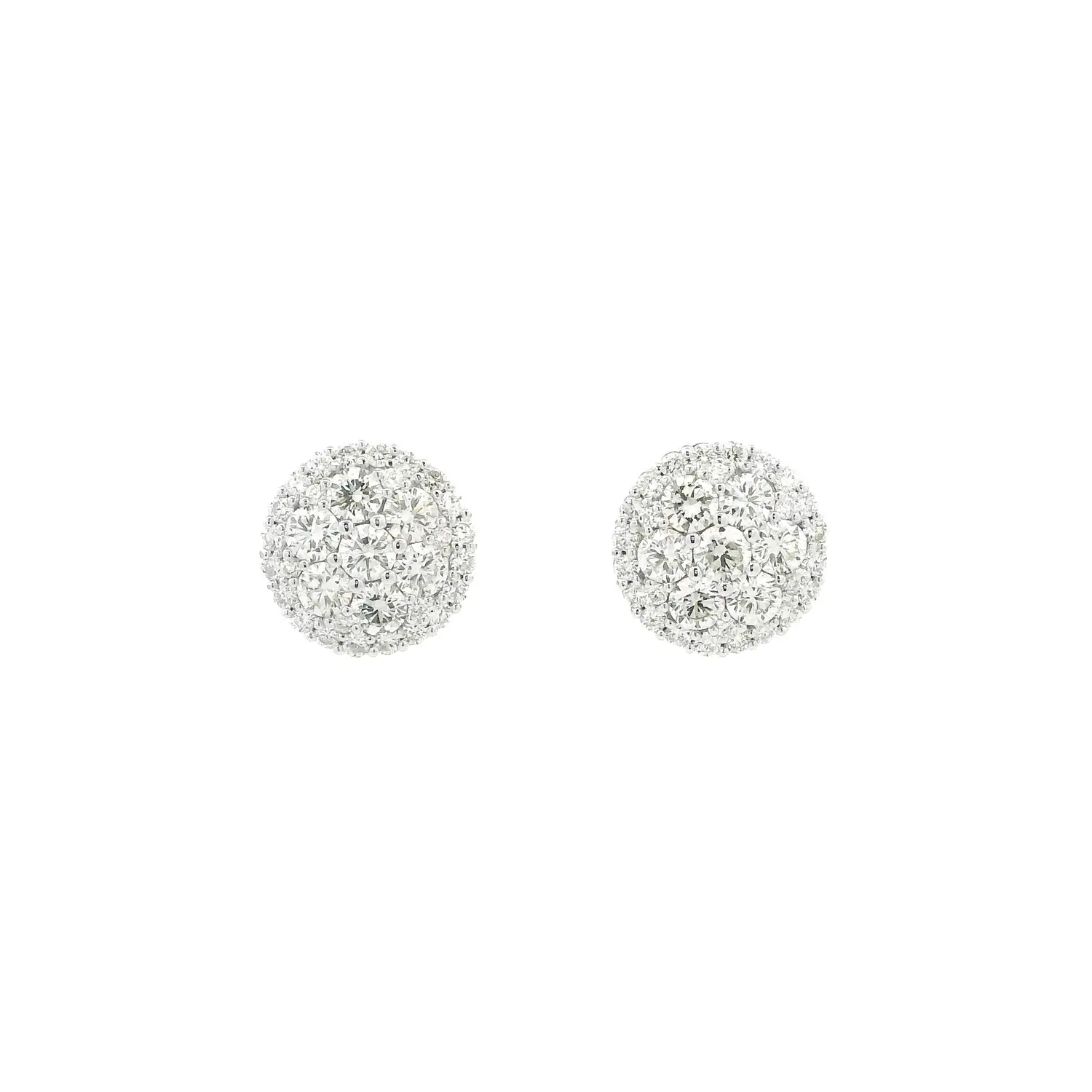 Tyto elegantní náušnice z bílého zlata okouzlí svým jemným, ale výrazným designem. Dominantním prvkem je kupolovitý tvar osazený desítkami brilantně broušených diamantů, které vytvářejí souvislou třpytivou plochu. Díky preciznímu pavé osazení působí náušnice luxusně a přitom dokonale harmonicky.