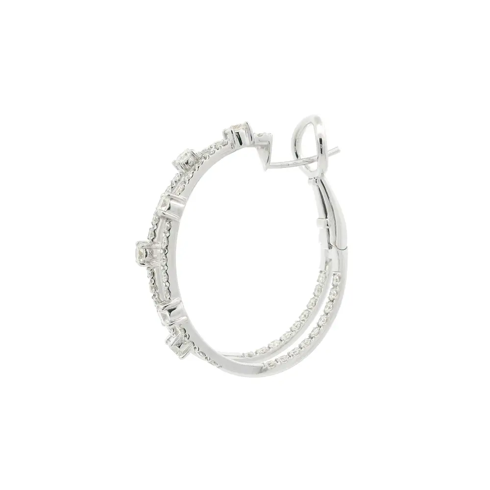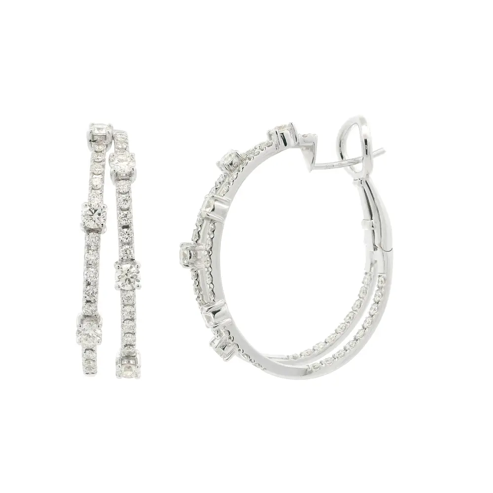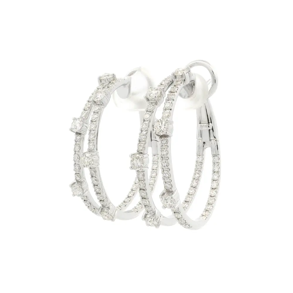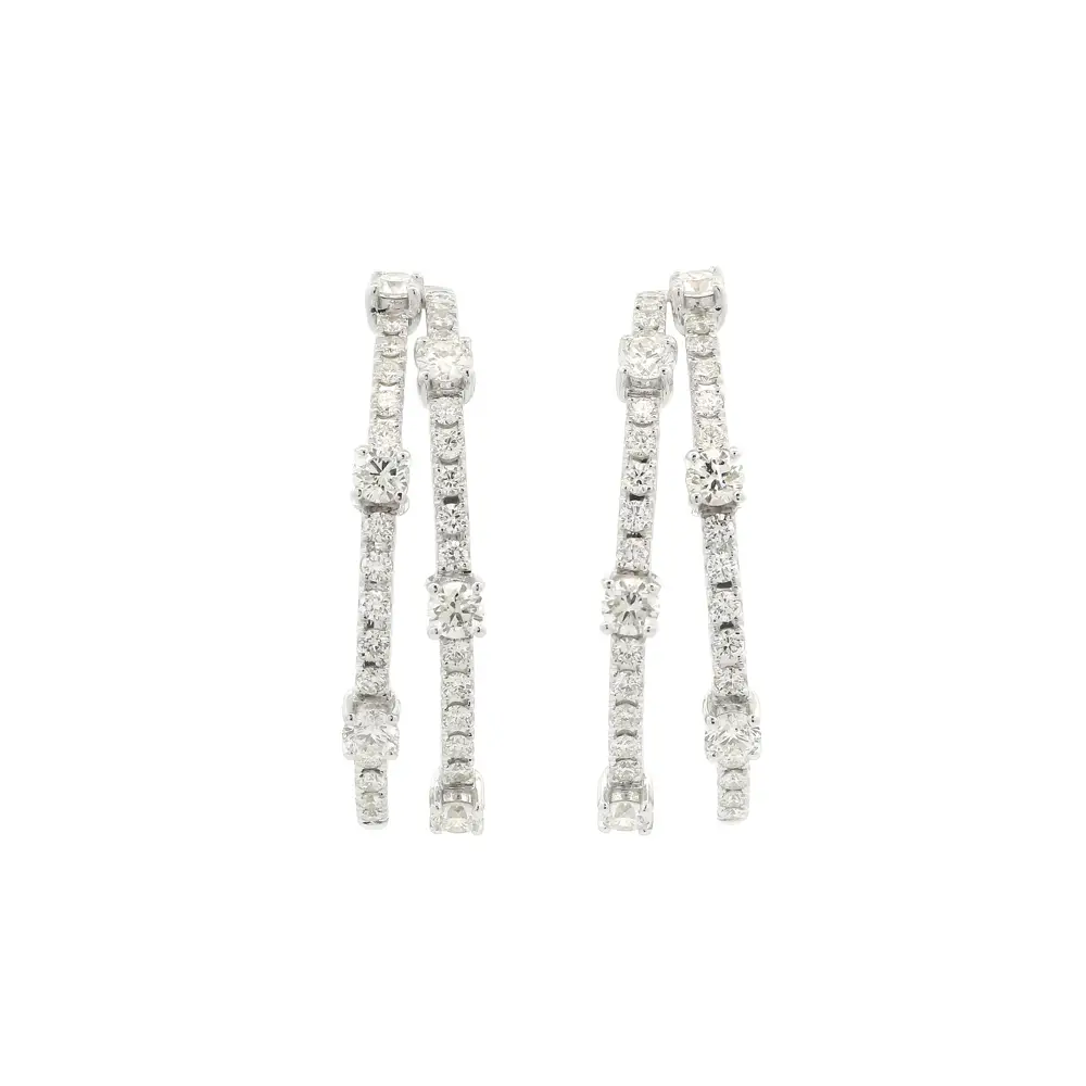 Tyto mimořádně elegantní náušnice z 18kt bílého zlata přinášejí jedinečnou hru světla a pohybu. Jejich dvojitý kruhový design zdobí precizně osazené brilianty různé velikosti, které vytvářejí dynamický třpyt a optickou hloubku při každém pohybu.
