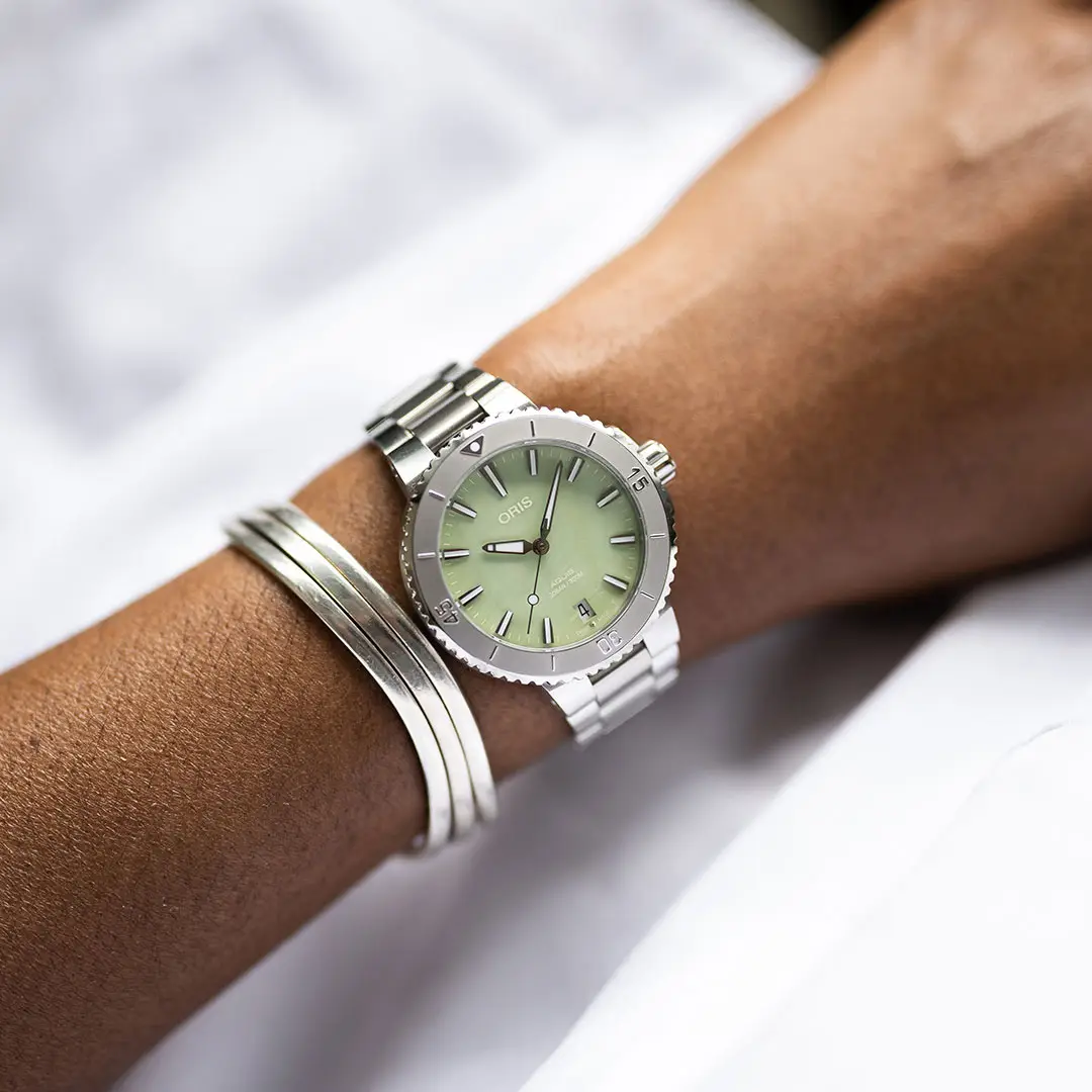 Hodinky doplňuje ocelový náramek s bezpečnostní skládací sponou a prodlužovacím článkem, který zajišťuje pohodlí i při potápění. Spojení technické preciznosti, švýcarské kvality a jemného ženského designu dělá z Oris Aquis Date výjimečný kousek pro ženy, které oceňují styl i výkon.
