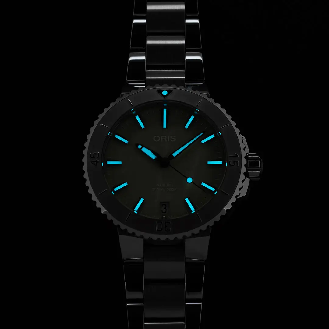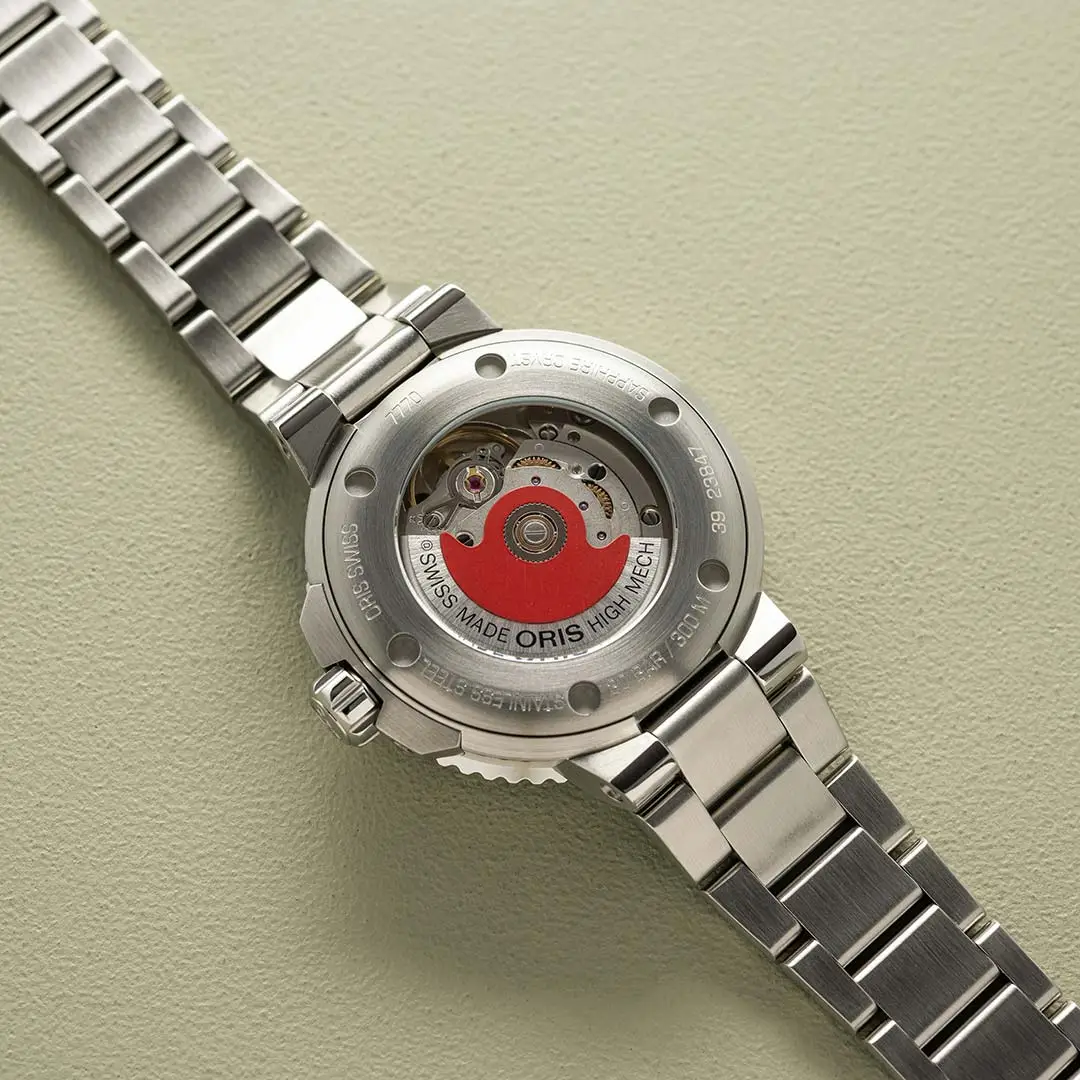 Uvnitř tiká spolehlivý automatický kalibr Oris 733 s rezervou chodu přibližně 41 hodin, který je viditelný přes průhledné šroubovací dýnko. Díky voděodolnosti 300 metrů (30 bar) je model plně připraven na náročné podmínky pod vodou i každodenní nošení.