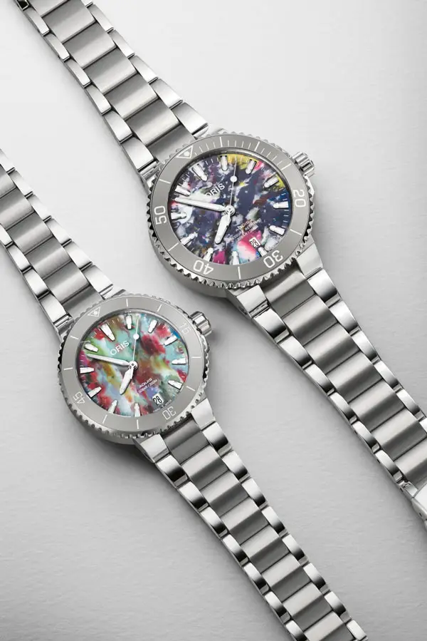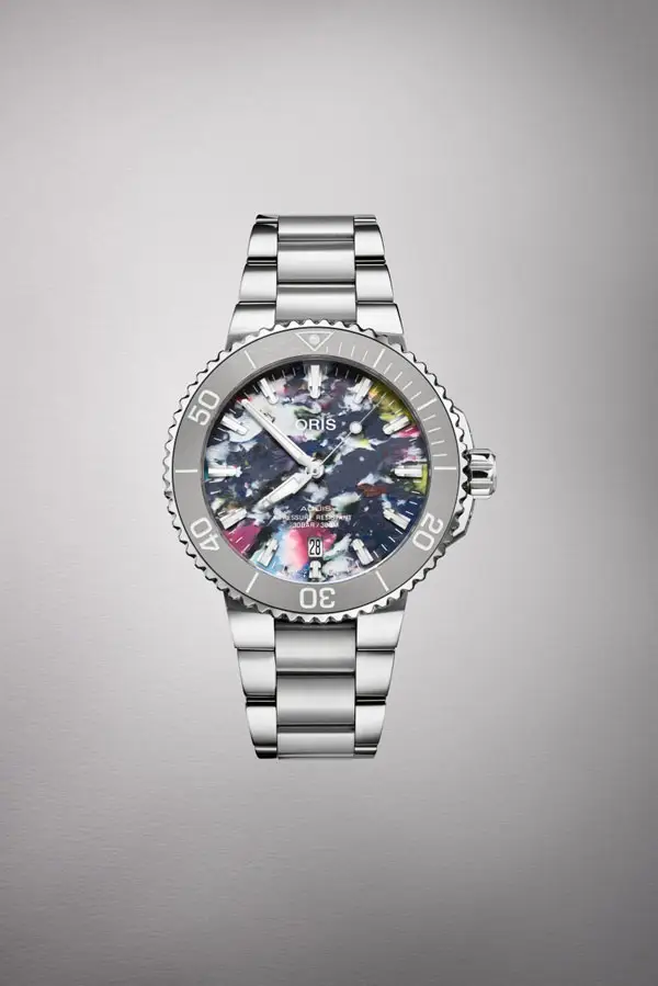 Nejvýraznějším prvkem modelu je číselník z recyklovaného PET plastu, který dělá každý kus naprosto jedinečným — žádné dva ciferníky nejsou stejné. Tento prvek symbolizuje ekologické poslání značky Oris a její závazek k ochraně oceánů. O pohon se stará automatický kalibr Oris 733 s rezervou chodu přibližně 41 hodin, viditelný skrze průhledné dýnko.