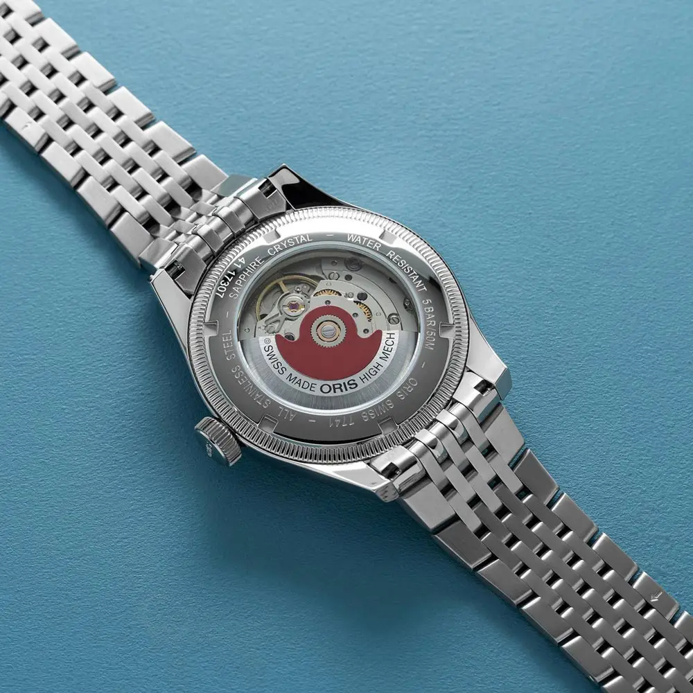 Hodinky využívají ikonickou funkci Pointer Date, kdy centrální ručka s červenou špičkou ukazuje aktuální datum na vnějším prstenci číselníku. O přesný chod se stará automatický kalibr Oris 754, založený na spolehlivém SW 200-1, s rezervou chodu 38 hodin a funkcí zastavení sekundové ručky.