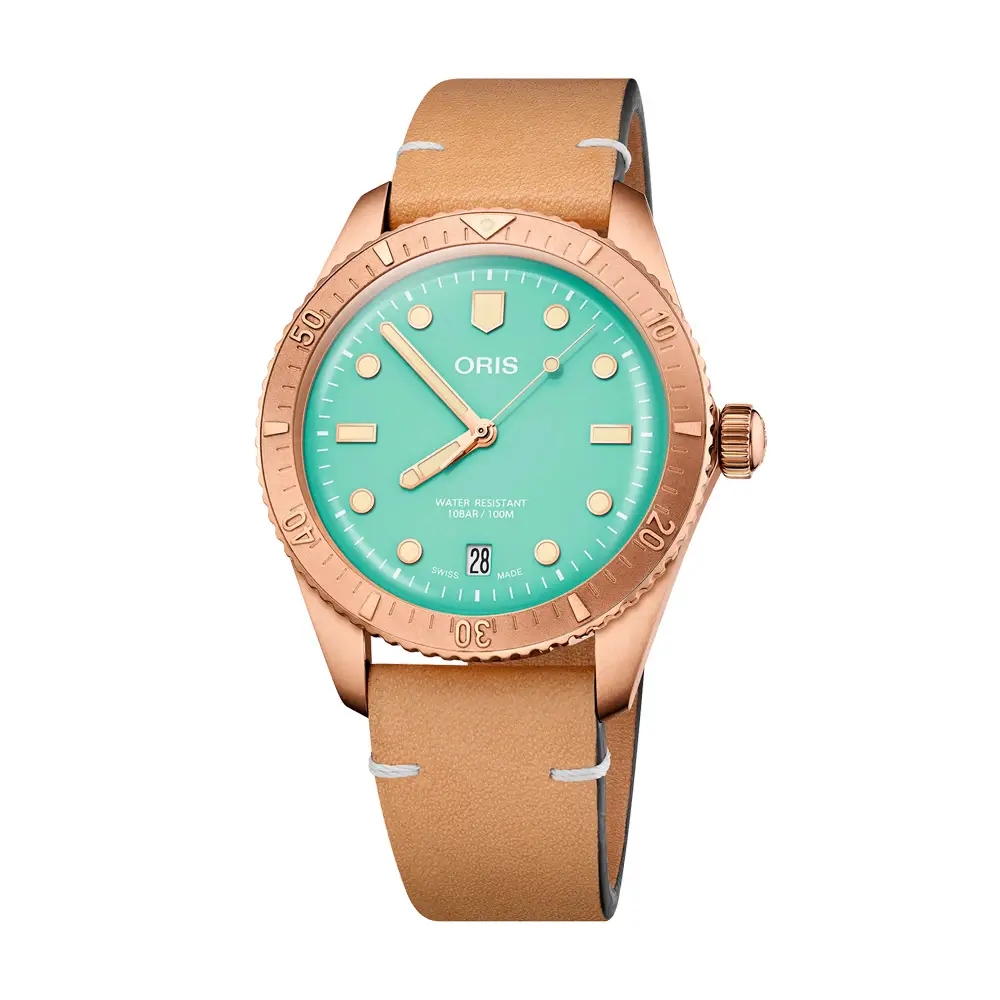 Model je voděodolný do 100 metrů (10 bar) a doplněn o hnědý kožený řemínek, který umocňuje retro charakter hodinek. Oris Divers Sixty-Five je poctou legendární éře potápěčských hodinek – spojením dobového stylu, kvalitního řemesla a moderní funkčnosti, určeným pro milovníky autenticity a švýcarského designu.