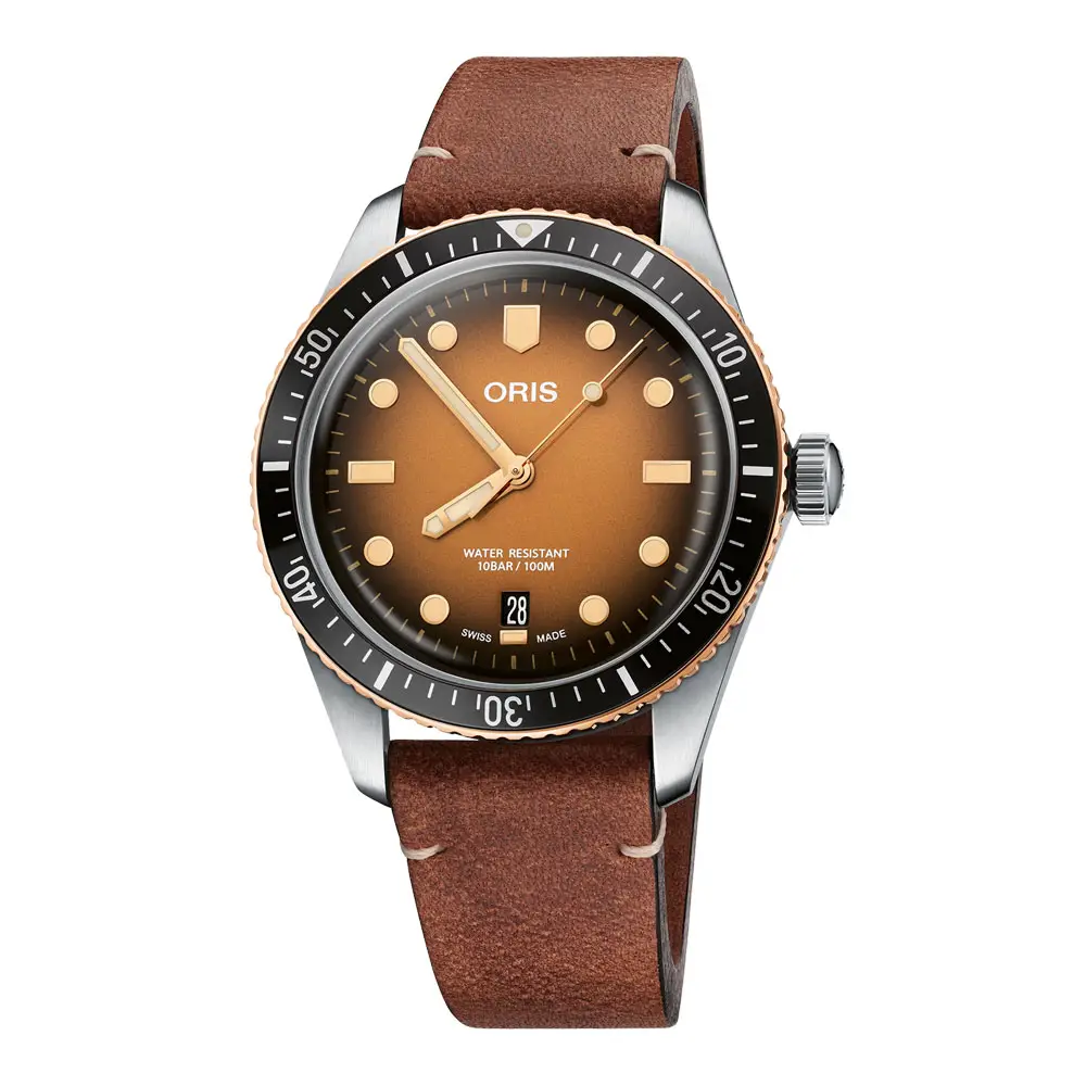 Model Oris Divers Sixty-Five Date 01 733 7707 4356-07 5 20 45 od Oris představuje stylové spojení vintage potápěčského designu a moderní švýcarské hodinářské techniky. Pouzdro o velikosti 40 mm z nerezové oceli doplňuje bronzová jednosměrně otočná luneta, která postupem času získává unikátní patinu. Elegantní hnědý gradientní ciferník s luminiscencí Super-LumiNova® zajišťuje skvělou čitelnost, zatímco klenuté safírové sklíčko s antireflexní úpravou chrání hodinky před poškrábáním.