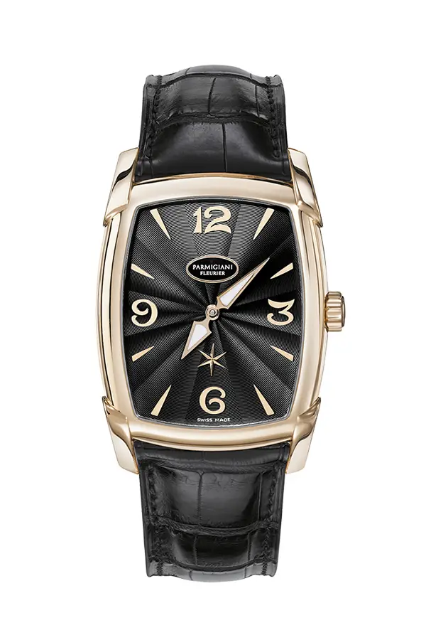 Charakteristické soudkovité pouzdro o rozměrech 38,5 × 31,2 mm je vyrobeno z ušlechtilého 18kt růžového zlata, které hodinkám dodává sofistikovaný a nadčasový vzhled. Celý design podtrhuje safírové sklíčko, jež chrání minimalistický a stylový černý analogový ciferník, který působí elegantně a decentně zároveň.