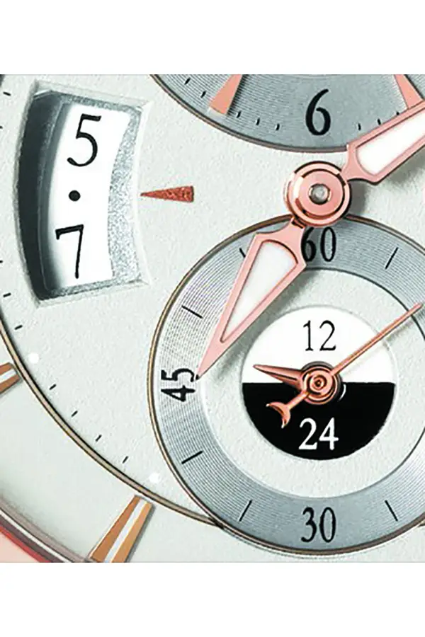 Dominantou je bílý analogový ciferník s čistým designem, doplněný o praktickou datumovku a přehlednou funkci duálního času, která umožňuje sledovat dvě časové zóny zároveň – ideální pro ty, kteří často cestují. Uvnitř tiká mechanický strojek s automatickým nátahem, jenž zajišťuje precizní chod bez nutnosti ručního natahování.