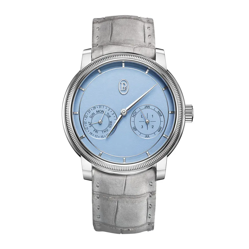 Parmigiani Toric Quantième Perpétuel “Morning Blue” (PFH952-2010002-300181) je luxusní společenský model, který propojuje věčný kalendář s nadčasovou elegancí. Pouzdro z platiny 950 s charakteristickým Toric vroubkovaným rámečkem je doplněno o ručně zrněný ciferník v odstínu „Morning Blue“, který podtrhuje hloubku a sofistikovaný vzhled.