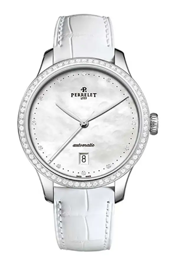 Dámské hodinky Perrelet, které jsou součástí kolekce First Class, se vyznačují elegantním a jemným zpracováním, a tak jsou dokonalým odrazem citlivé a něžné ženské duše. Na ciferníku zasazeném v ocelovém pouzdru se nachází datumovka a analogový číselník ozdobený diamanty. Ty zdobí i lunetu, kterou perfektně doplňuje bílý kožený pásek.