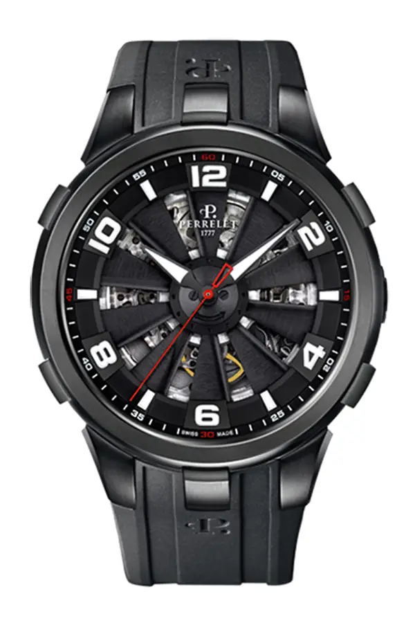 Sportovní pánské hodinky značky Perrelet pro aktivní muže, kteří dokážou ocenit precizní designové i technické zpracování. Model je součástí kolekce Turbine. Hodinky mají klasickou černou barvu, se kterou skvěle kontrastuje několik drobných bílých detailů na ciferníku. Pouzdro a luneta jsou z ocele a černého PVD a pásek z kaučuku.