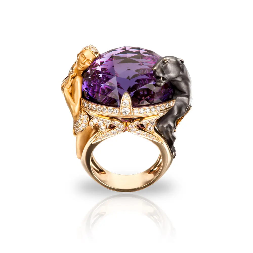 Prsten je osazen 147 bílými diamanty o celkové hmotnosti 1,41 ct, které vytvářejí intenzivní třpyt v pavé stylu. Dominantním prvkem je centrální ametyst o hmotnosti 15,16 ct, jenž dodává šperku hloubku, barevnost a exkluzivní charakter. Precizní ruční zpracování a kvalitní osazení kamenů zaručují dlouhou životnost i špičkovou kvalitu.