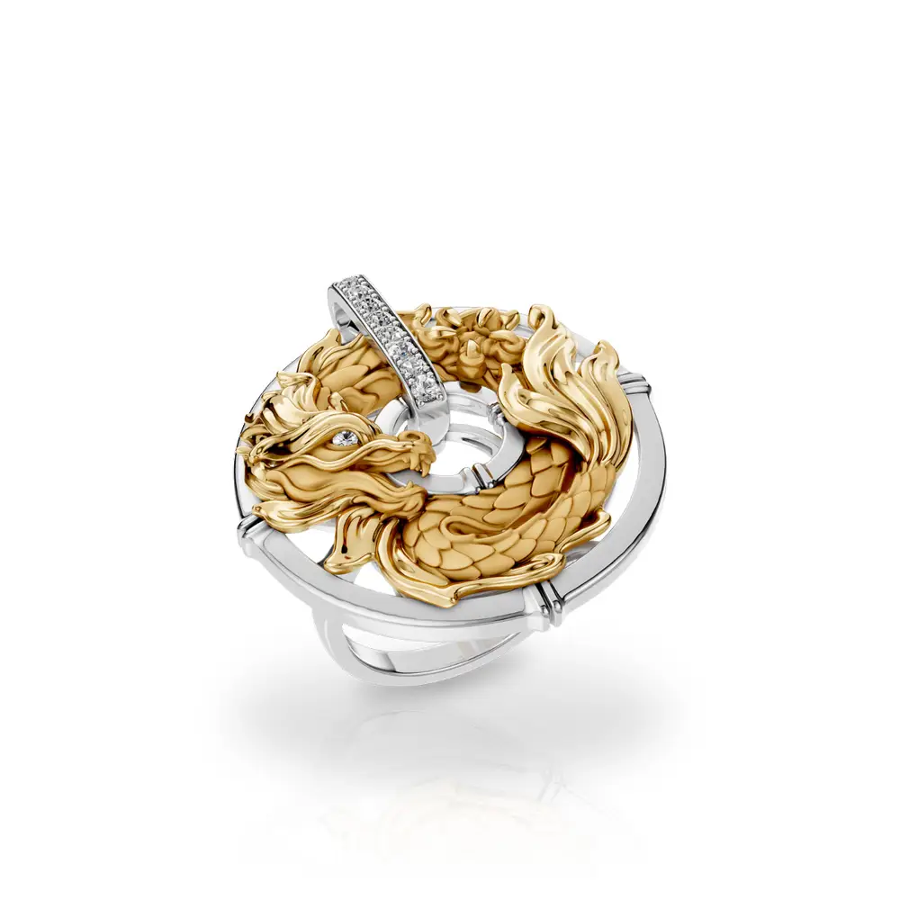 Dámský prsten Carrera y Carrera New Shanghai Medium od Carrera y Carrera představuje harmonické spojení precizního šperkařského řemesla a elegantního designu. Je vyroben z 18kt žlutého a bílého zlata, jejichž kombinace vytváří sofistikovaný kontrast a nadčasový vzhled. Design inspirovaný orientální symbolikou kolekce New Shanghai odkazuje na sílu, rovnováhu a moderní luxus.