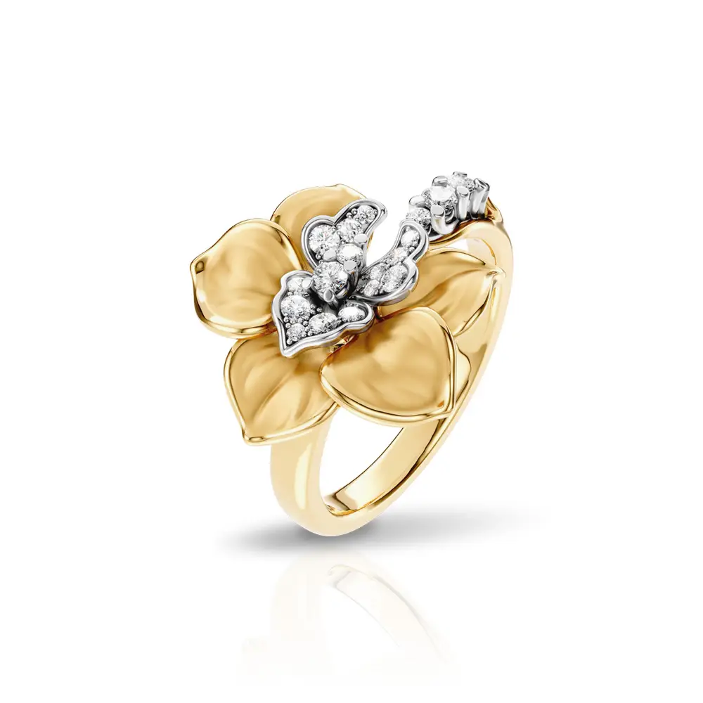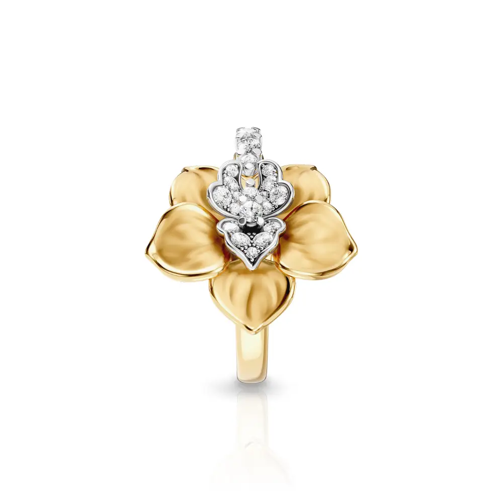 Carrera y Carrera Orquídeas prsten z kolekce Orquídeas od Carrera y Carrera představuje precizně zpracovaný luxusní šperk inspirovaný tvarem rozkvetlé orchideje. Prsten je vyroben z 18kt žlutého a bílého zlata, které zajišťuje vysokou odolnost, dlouhou životnost a vizuálně atraktivní kontrast. Dominantním prvkem je sochařsky zpracovaný motiv orchideje, charakteristický jemnou modelací okvětních lístků a propracovanou hrou světla a objemu.
