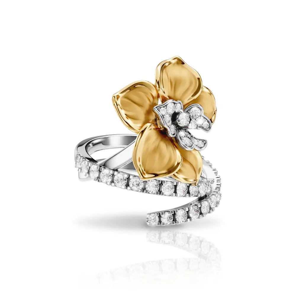 Carrera y Carrera Orquídeas Maxi prsten z kolekce Orquídeas od Carrera y Carrera představuje precizně zpracovaný luxusní šperk inspirovaný tvarem rozkvetlé orchideje. Prsten je vyroben z 18kt bílého zlata, které zajišťuje vysokou odolnost, dlouhou životnost a elegantní vzhled. Dominantním prvkem je sochařsky zpracovaný motiv orchideje, charakteristický jemnou modelací okvětních lístků a propracovanou hrou světla.