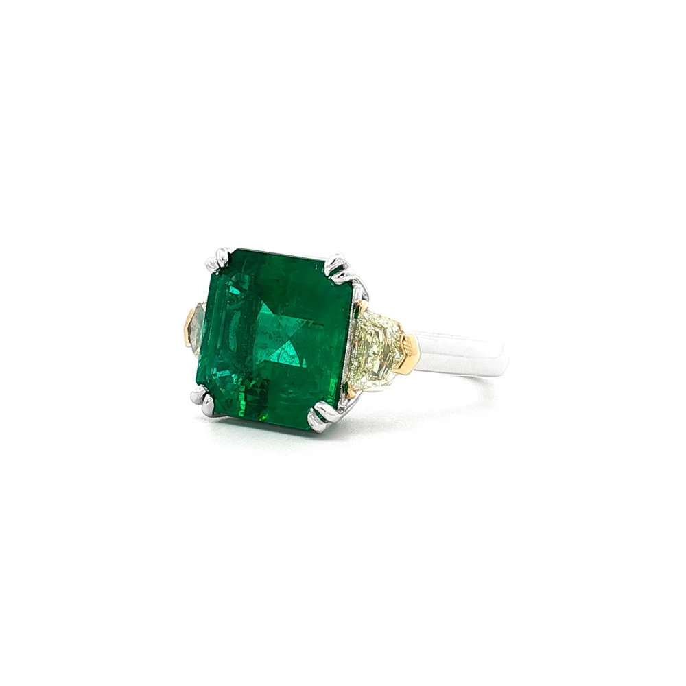 Po jeho stranách jsou precizně zasazeny vzácné žluté diamanty, jejichž záře vytváří dokonalý kontrast s hlubokým tónem smaragdu. Spojení jasně zelené a zlatavé brilance podtrhuje luxusní provedení a mistrovství šperkařského řemesla.