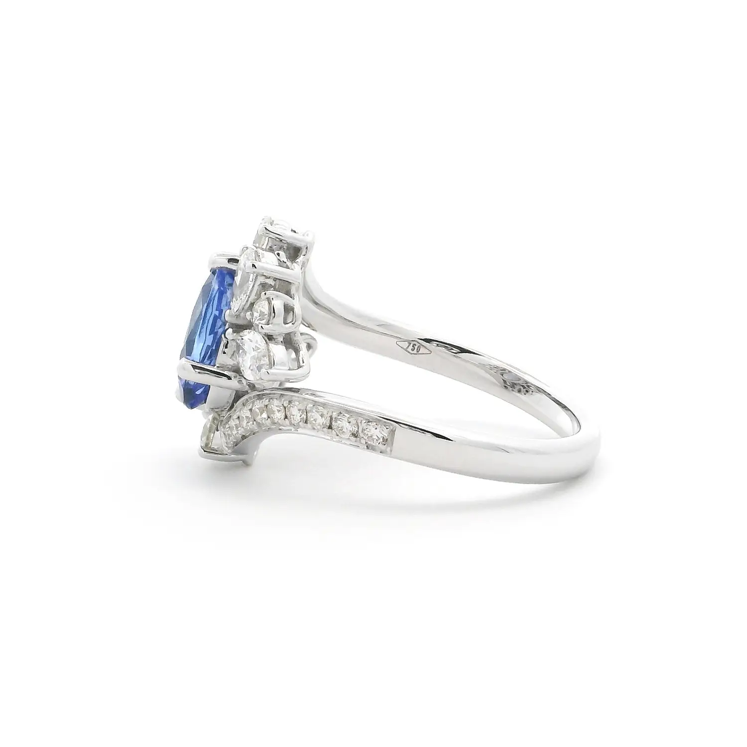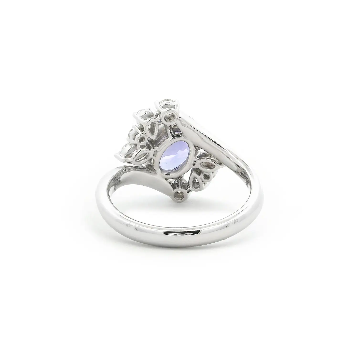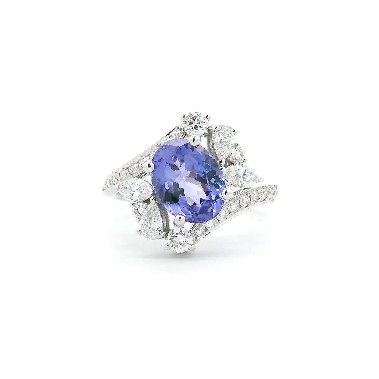 Prsten s tanzanitem a diamanty v 18k bílém zlatě ztělesňuje spojení vzácnosti, elegance a jemné ženskosti. Středem kompozice je oválný tanzanit s výrazným modrofialovým odstínem, jehož barva se mění podle dopadu světla. Tento drahokam, objevený pouze v Tanzanii, je symbolem originality a duchovní rovnováhy.
