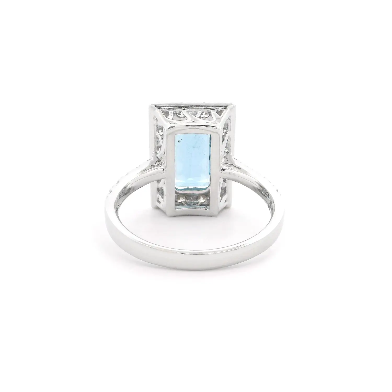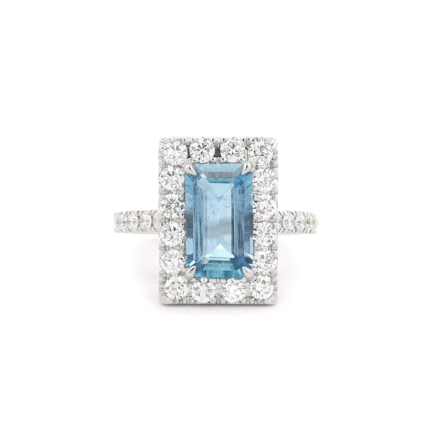 Tento luxusní prsten z bílého zlata s akvamarínem a diamanty je skutečným klenotem, který v sobě spojuje precizní zpracování, harmonii tvarů a přirozenou krásu drahých kamenů. V jeho středu se vyjímá obdélníkově broušený akvamarín s průzračnou modří připomínající hlubiny oceánu – symbol klidu, odvahy a čistoty. Kolem centrálního kamene se rozprostírá dvojitá řada briliantově broušených diamantů, které září s každým pohybem a umocňují jas akvamarínu. Jejich dokonale vyvážené rozmístění vytváří dojem hloubky a světelné hry, zatímco diamanty pokračující po obroučce prstenu dodávají šperku souvislý, jiskřivý efekt a mimořádnou eleganci.