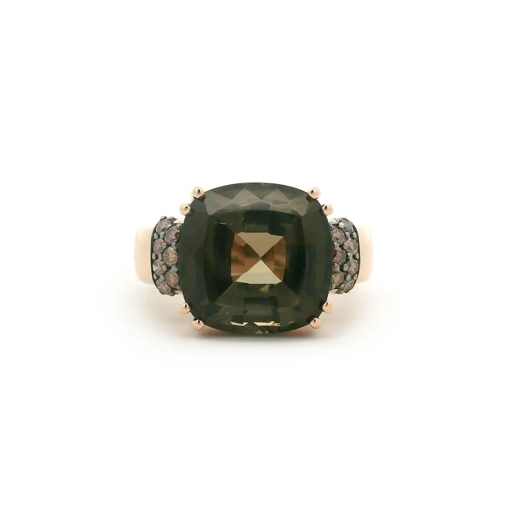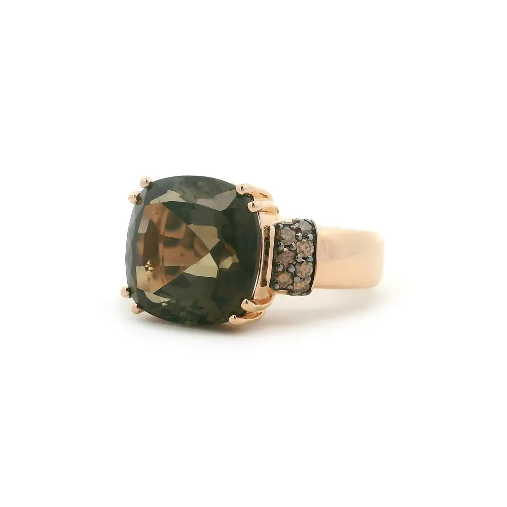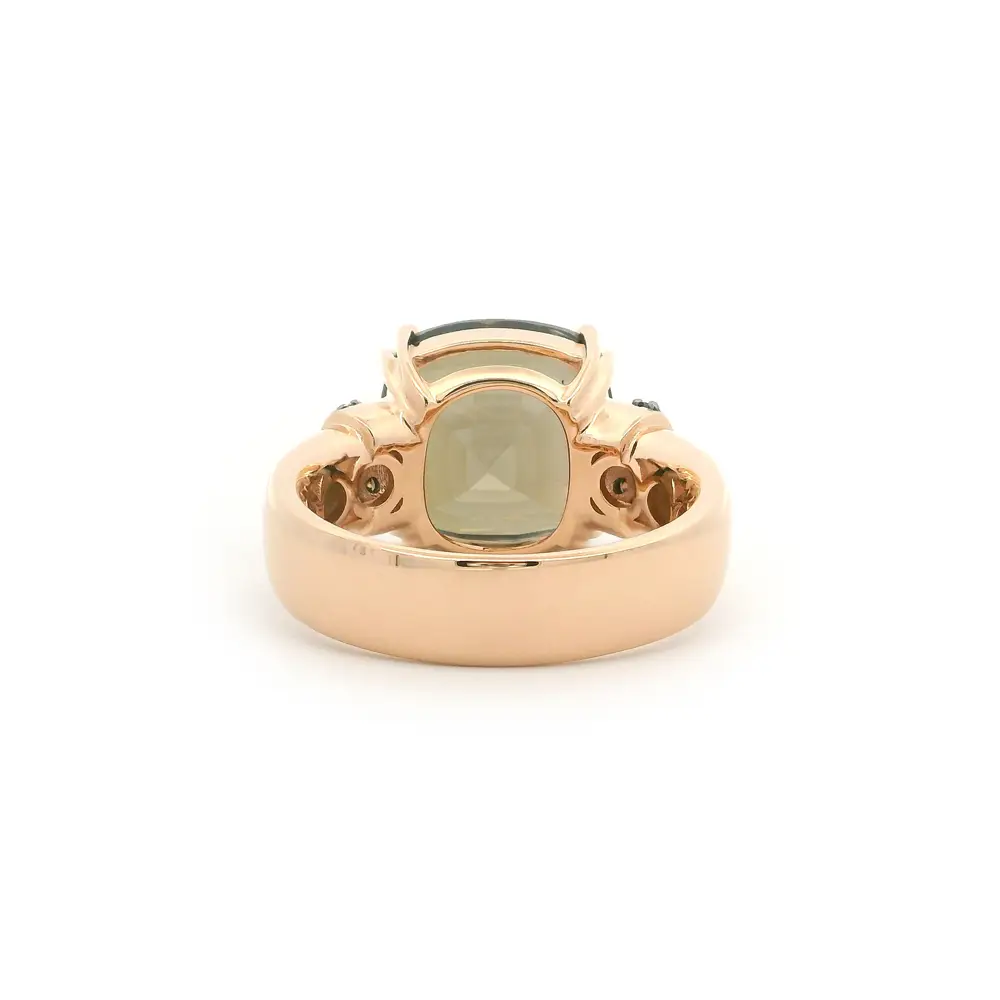 Tento elegantní prsten z 18kt růžového zlata upoutá svým sofistikovaným kontrastem teplých tónů. Ve středu září velký zelený turmalín v polštářovém brusu, jehož hluboká barva se nádherně doplňuje s odstínem kovu. Boky prstenu jsou osazeny třpytivými hnědými diamanty, které dodávají šperku hloubku, originalitu a luxusní charakter.