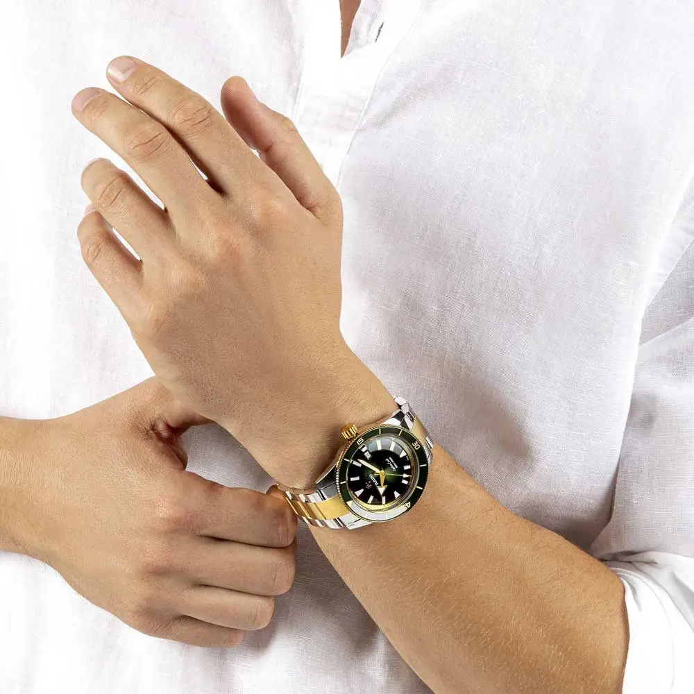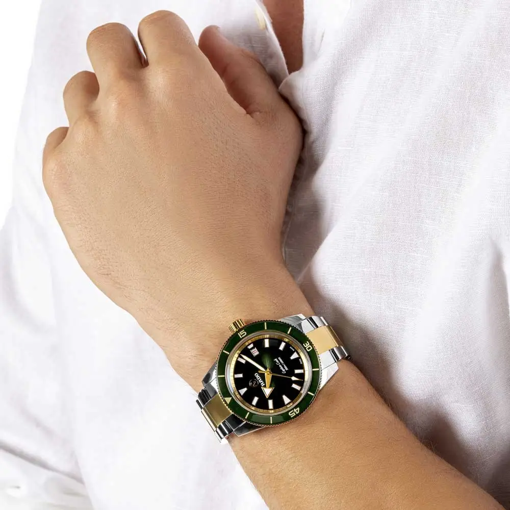 Na první pohled upoutá zelený analogový ciferník s výraznými indexy a ručičkami, chráněný safírovým sklíčkem s vysokou odolností proti poškrábání. Jednosměrně otočná keramická luneta ve stejné zelené barvě podtrhuje potápěčský charakter hodinek a dodává jim moderní estetiku.