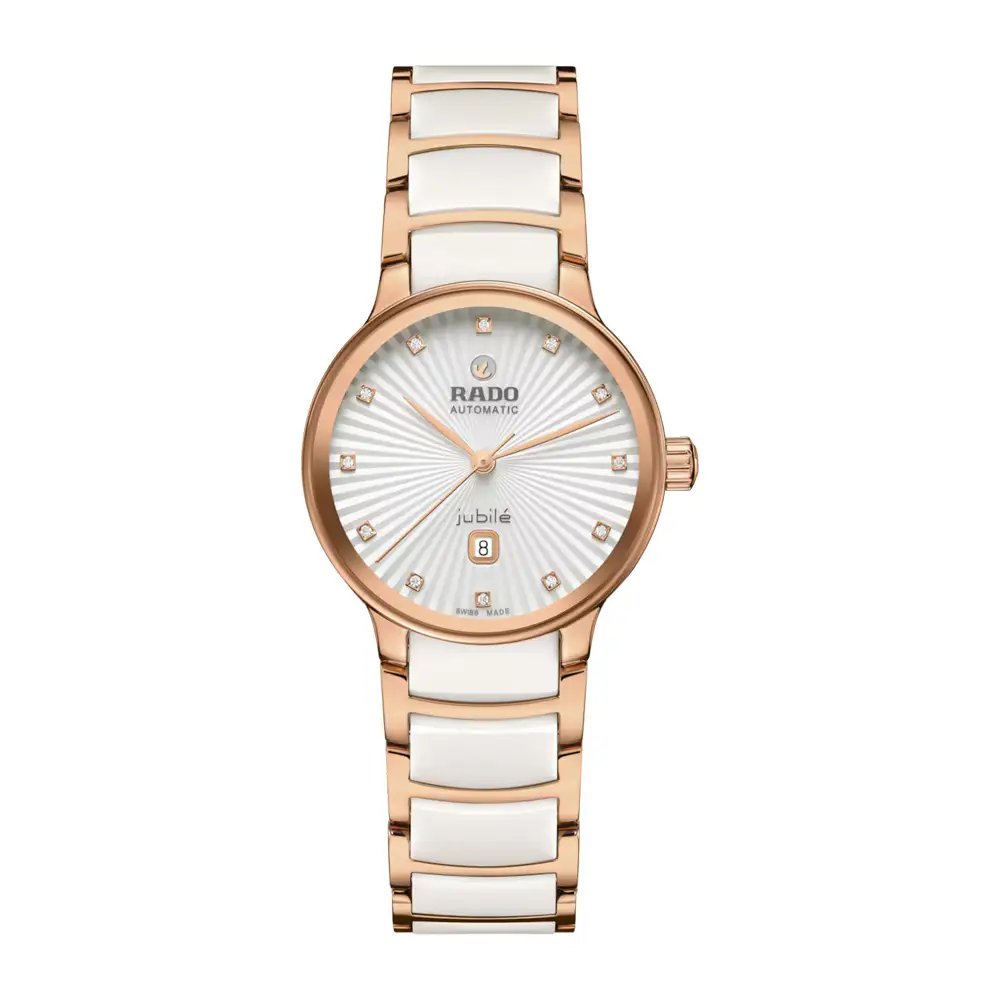Luxusní dámské hodinky Rado Centrix Automatic Diamonds (ref. R30019744) představují nadčasové spojení elegance a švýcarské preciznosti. Pouzdro o průměru 30,5 mm z nerezové oceli s PVD úpravou v odstínu růžového zlata působí jemně a sofistikovaně. Charakteristický design doplňuje zakřivené safírové sklíčko s antireflexní úpravou a ergonomicky tvarované pouzdro. Vodotěsnost 50 m (5 ATM) zajišťuje vhodnost pro každodenní nošení.