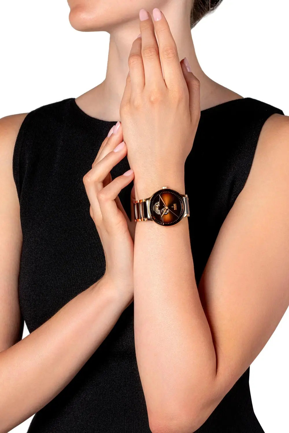 Hnědý ciferník s otevřeným srdcem nabízí pohled na precizní mechanický strojek s automatickým nátahem a rezervou chodu přibližně 80 hodin. Kryje jej safírové sklo, které zajišťuje maximální čitelnost a odolnost. Hnědý pásek z kombinace keramiky, oceli a růžového zlacení je zakončen překlápěcí sponou pro bezpečné a pohodlné nošení.