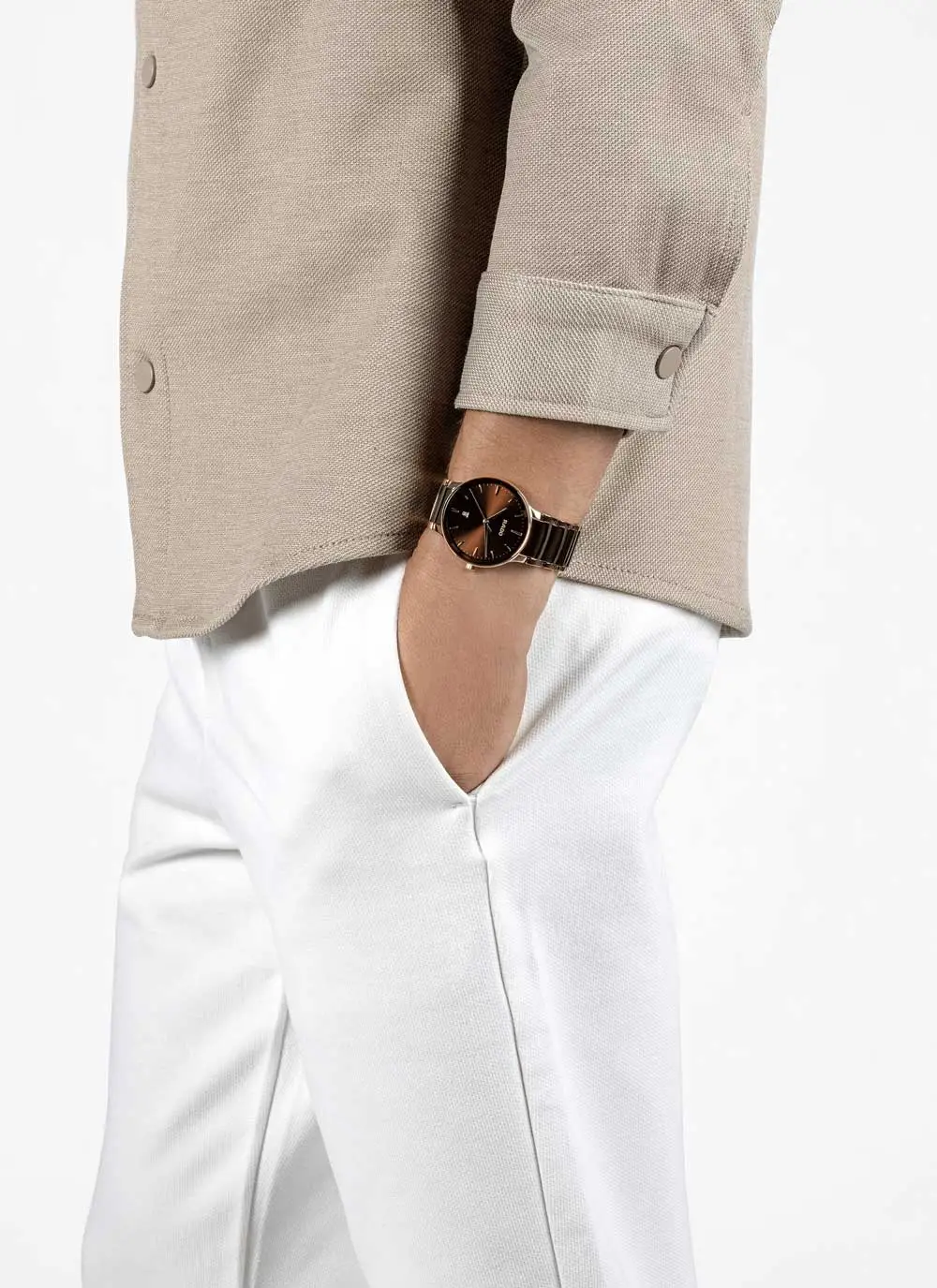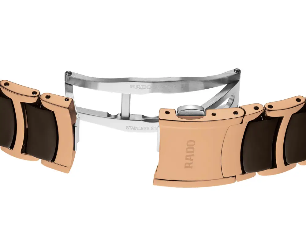 Luxusní Rado Centrix Quartz R30023302 spojuje nadčasovou eleganci s technickou špičkou. Kulaté pouzdro 39,5 mm z ušlechtilé oceli s růžovým PVD zlacením dodává hodinkám výrazný, moderní vzhled. Plynulé přechody mezi keramickou lunetou a hnědým ciferníkem s jemným slunečním efektem umocňují estetickou hloubku. Ciferník doplňuje datumovka na třetí hodině a je chráněn safírovým sklíčkem proti poškrábání.