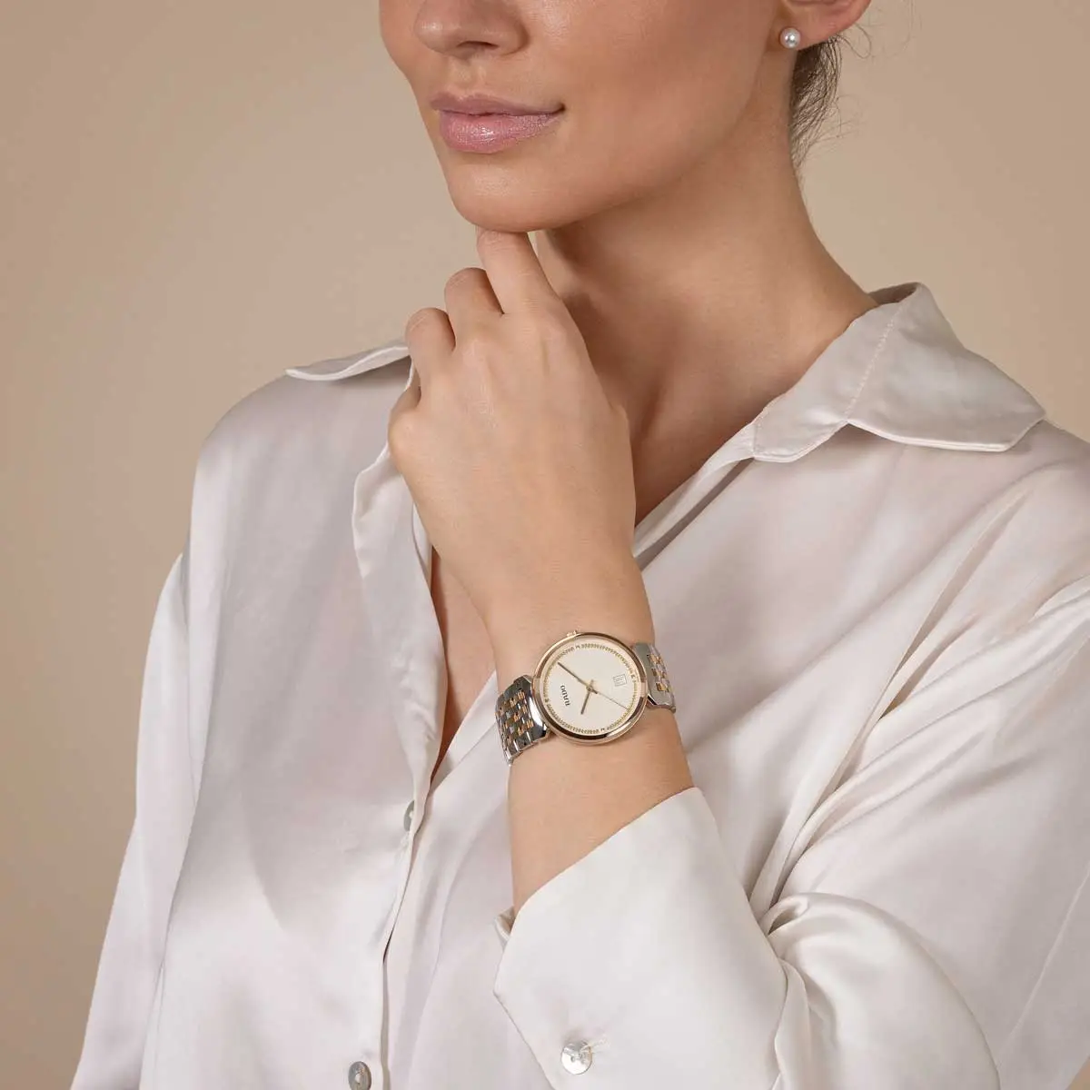 Luxusní bicolor tah z oceli a růžového zlacení plynule navazuje na pouzdro a zajišťuje příjemný pocit na zápěstí. Překlápěcí spona umožňuje bezpečné a pohodlné zapínání. Hodinky pohání spolehlivý quartzový strojek, který vyniká přesností a bezúdržbovým provozem.